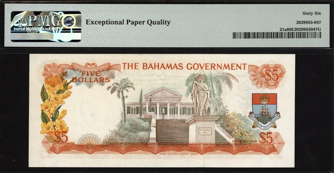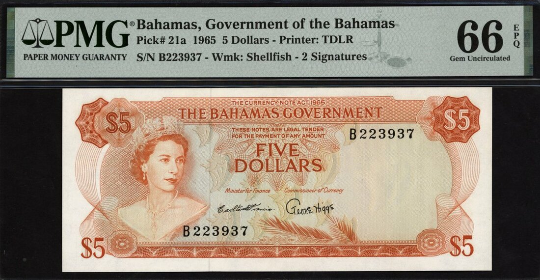 (x) The Bahamas Government, [Top Pop] $5, 1965, serial number B223937, (Pick 21a), in PMG holder 66 EPQ Gem Uncirculated