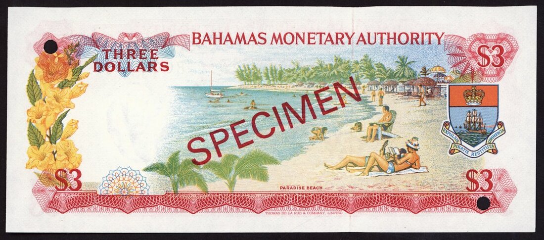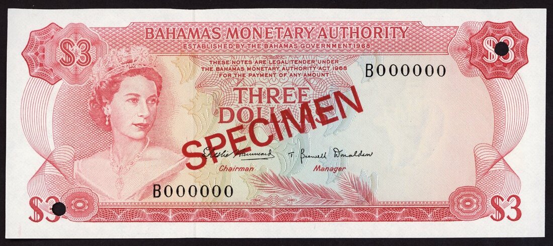 (x) Bahamas Monetary Authority, specimen $3, 1968, (Pick 28s), uncirculated