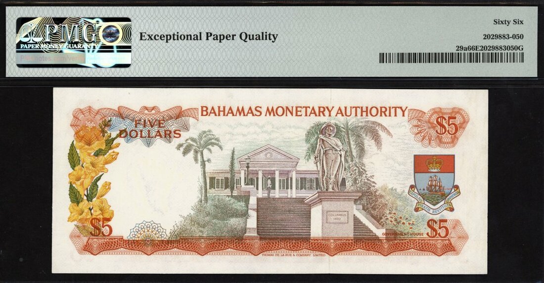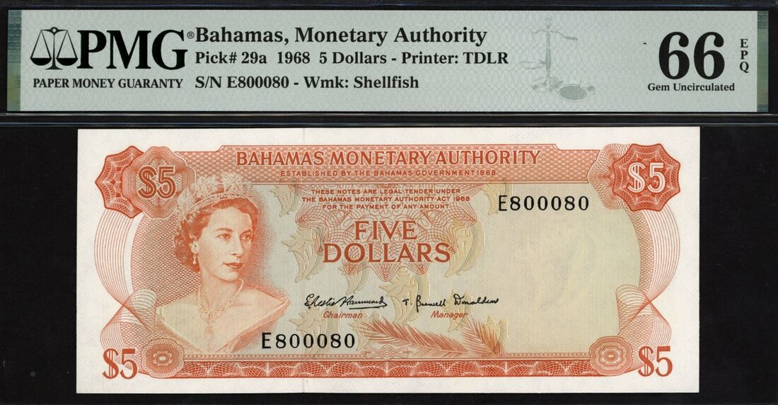 (x) Bahamas Monetary Authority, $5, 1968, serial number E800080, (Pick 29a, TBB B204a), interesting serial, in PMG holder 66 EPQ Gem Uncirculated. Second highest grade example on PMG Census