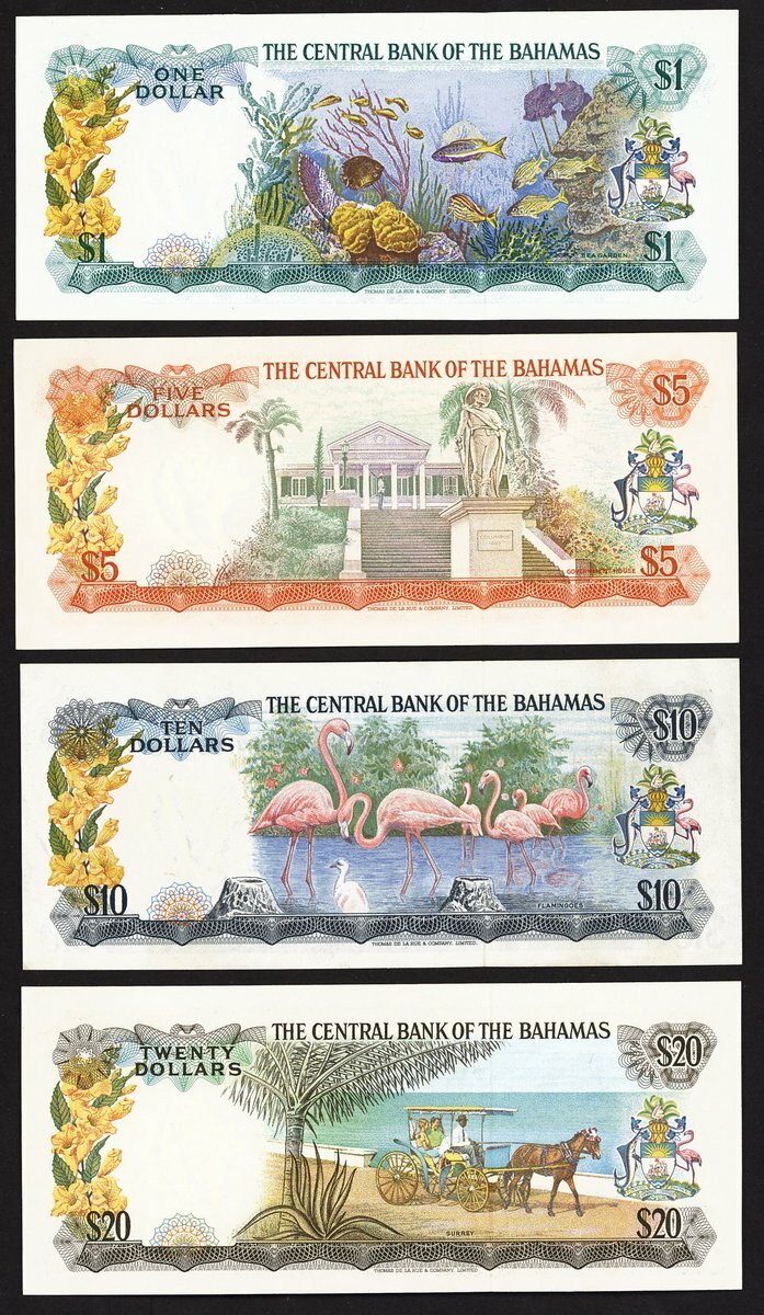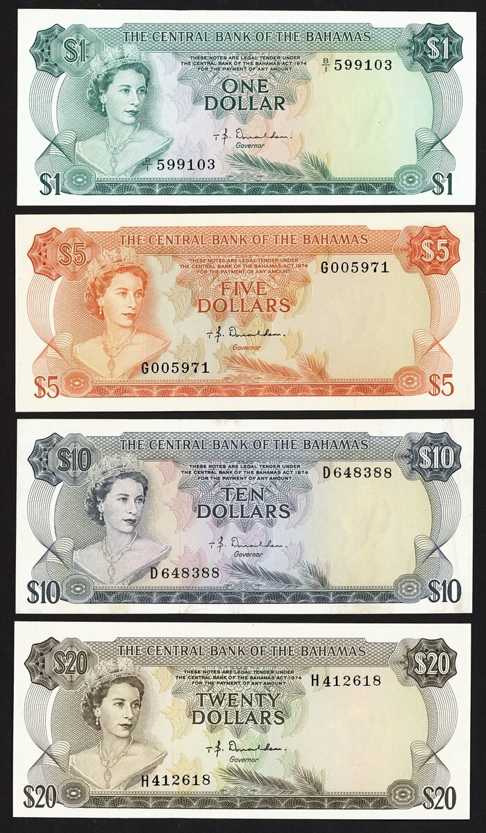 Central Bank of The Bahamas, $, $5, $10, $20, 1974, Queen Elizabeth II waring King George IV's state diadem