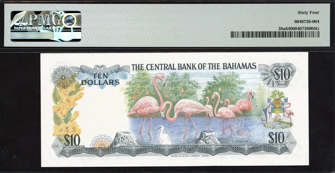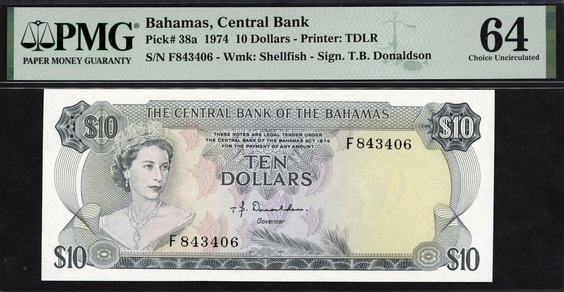 Central Bank of the Bahamas, $10, 1974, serial number F843406, (Pick 38a), in PMG holder 64 Choice Uncirculated