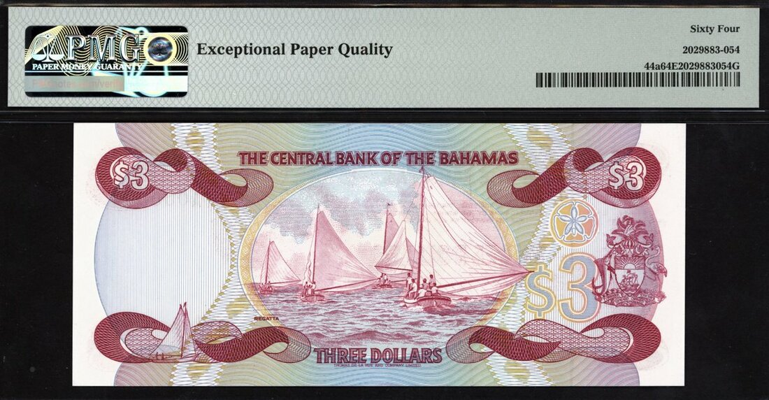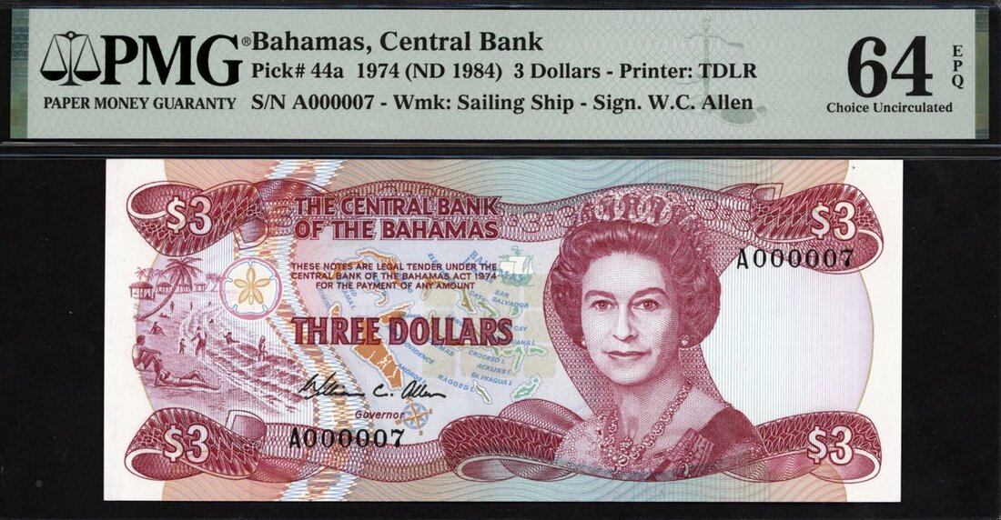 (x) Central Bank of The Bahamas, $3, ND (1984), serial number A000007, (Pick 44a, TBB B309a), in PMG holder 64 EPQ Choice Uncirculated, number 7 note!