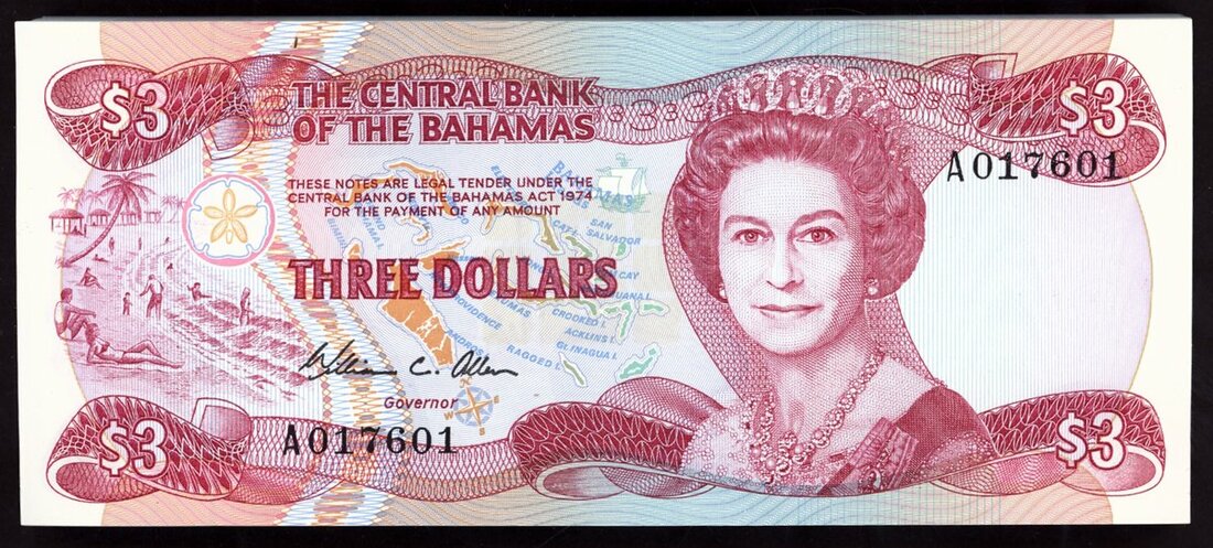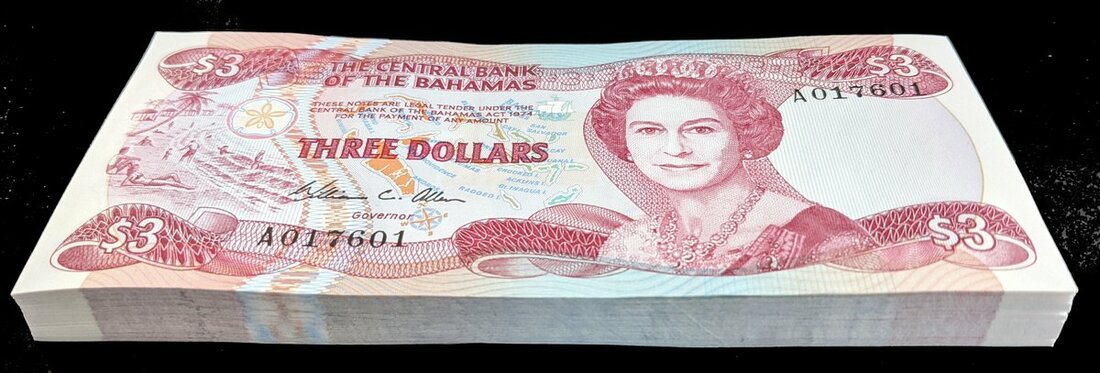 (x) Central Bank of The Bahamas, consecutive $3 (100), L.1974 (1984), serial number A017601 to A017700, (Pick 44a, TBB B309a), uncirculated (100 notes)