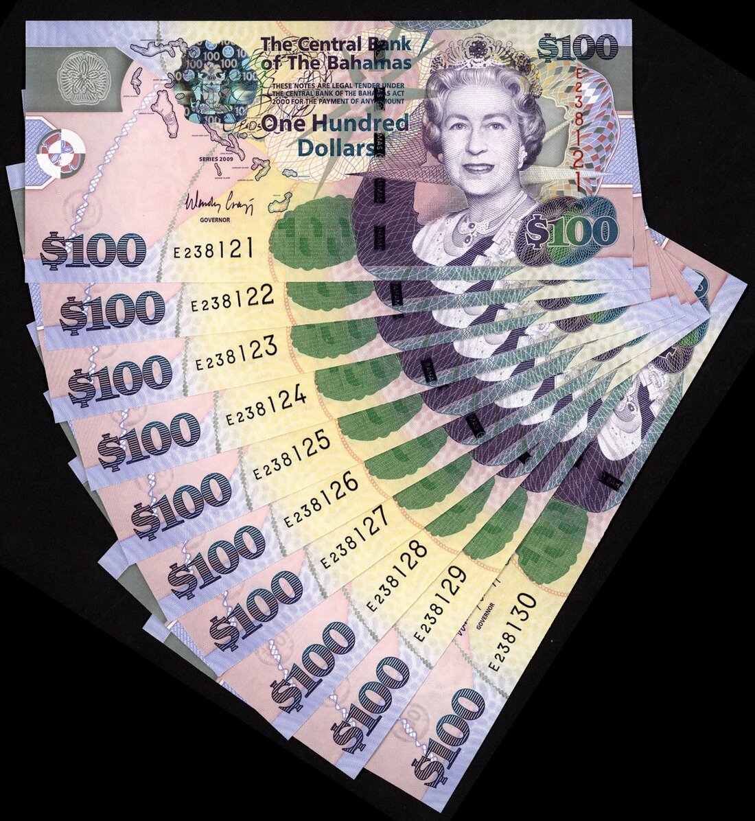 (x) Central Bank of The Bahamas, consecutive $100 (10), 2009, serial number E238121-30, (Pick 76, TBB B343), as issued uncirculated (10 notes)
