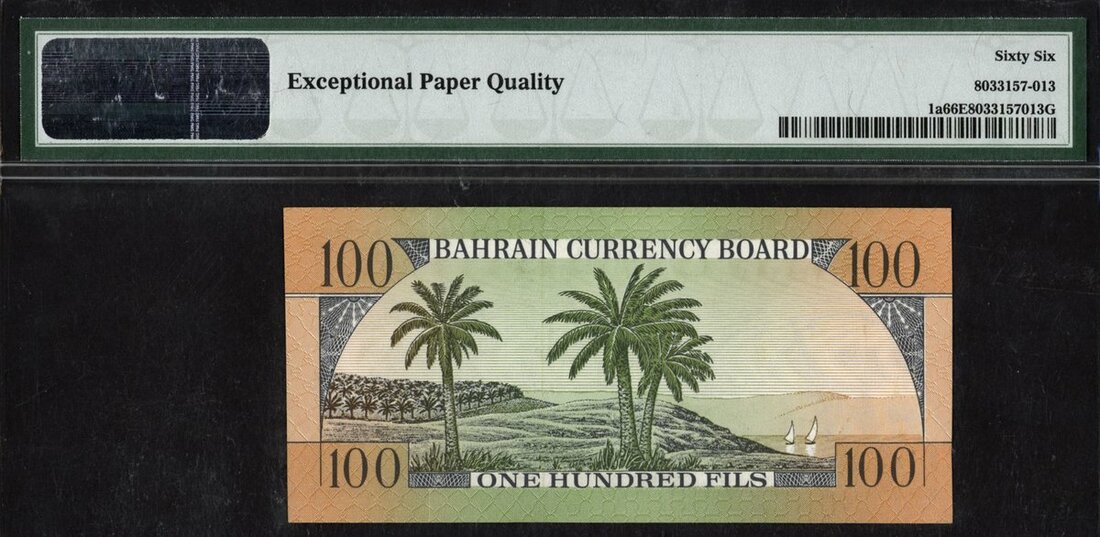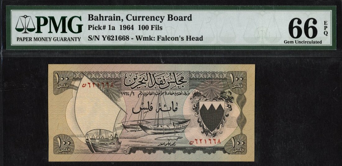 (x) Bahrain Currency Board, 100 fils, 1964, serial number Y621668, (Pick 1a, TBB B101a), in PMG holder 66 EPQ Gem Uncirculated