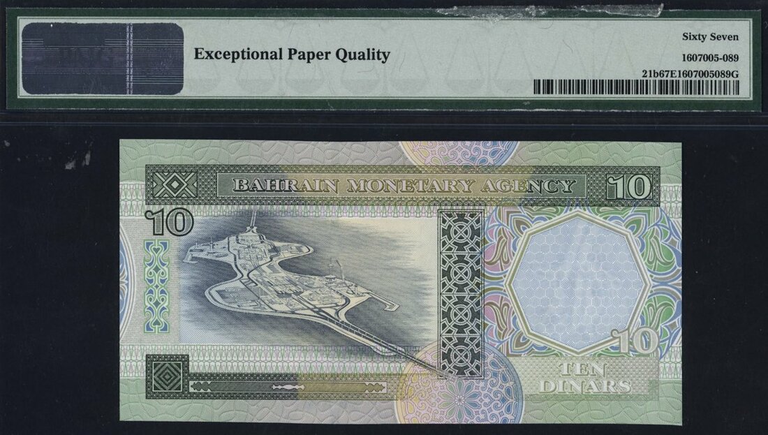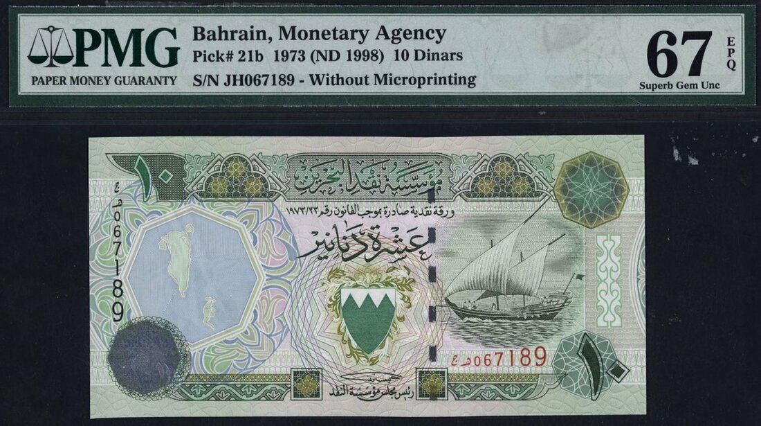 (x) Bahrain Monetary Agency, 10 dinars, 1973 (ND 1998), serial number JH067189, (Pick 21b, TBB B215), in PMG holder 67 EPQ Superb Gem Uncirculated, 2nd highest grade on PMG Census