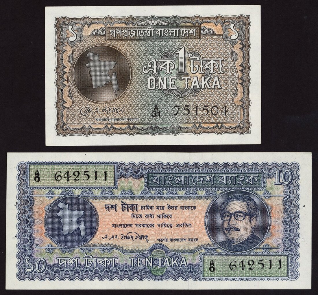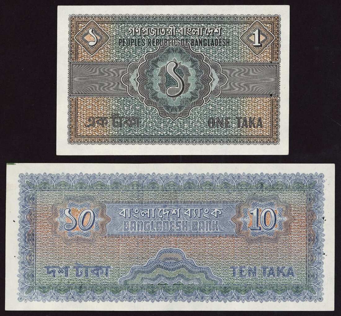 Bangladesh, 10 taka, ND (1972), serial number A/0 642511, also a 1 taka ND (1972),