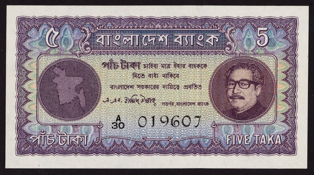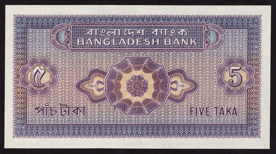 Bangladesh Bank, 5 taka, 1972, serial number A/30 019607, (Pick 7, TBB B301), pinholes at left, otherwise uncirculated