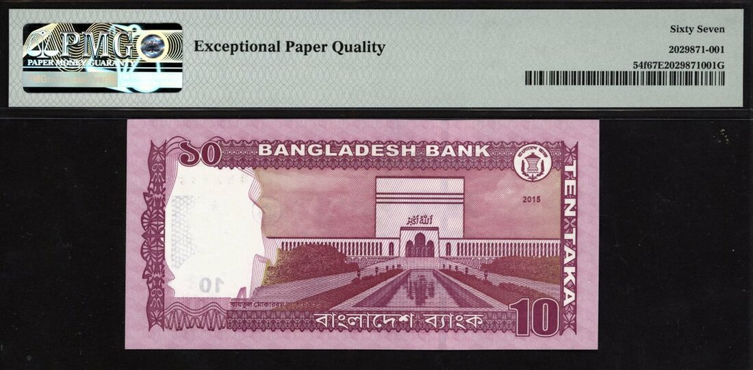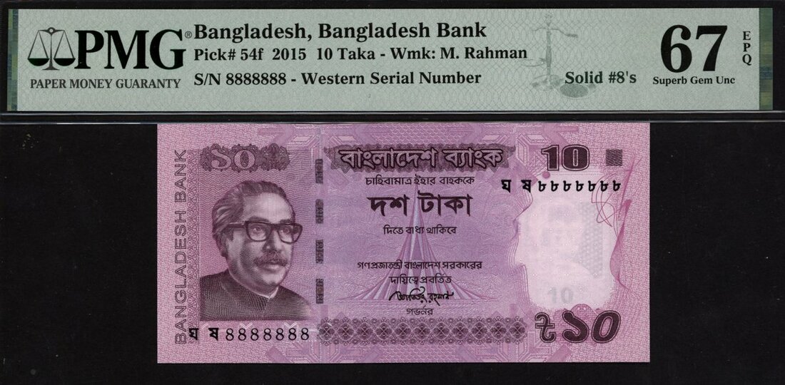 Bangladesh Bank, 10 taka, 2015, serial number 8888888, (Pick 54f), in PMG holder 67 EPQ Superb Gem Unc. PMG Census top pop