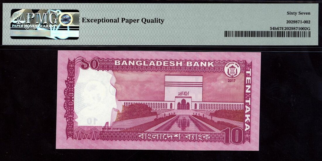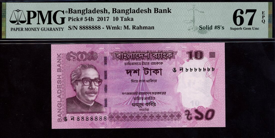 Bangladesh Bank, [Top Pop] 10 taka, 2017, solid serial number 8888888, (Pick 54h), in PMG holder 67 EPQ Superb Gem Unc. The only top pop example