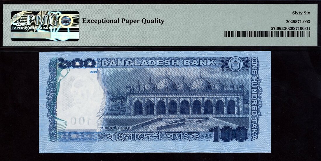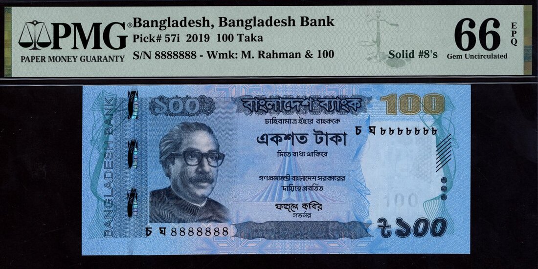 Bangladesh Bank, [Top Pop] 100 taka, 2019, solid serial number 8888888, (Pick 57i), in PMG holder 66 EPQ Gem Uncirculated