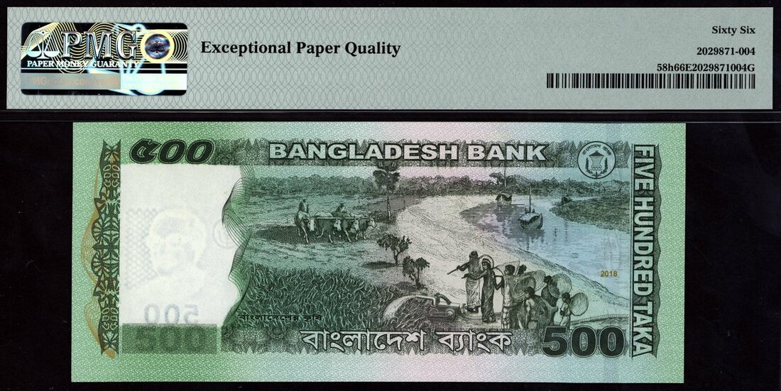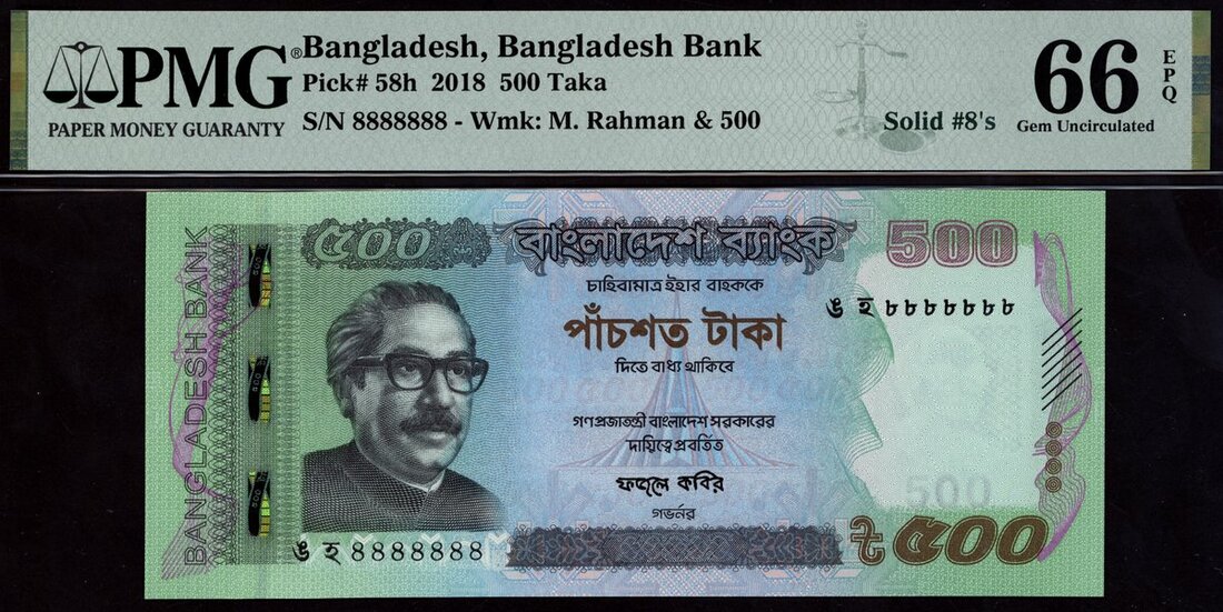 Bangladesh Bank, 500 taka, 2018, solid serial number 8888888, (Pick 58h), in PMG holder 66 EPQ Gem Uncirculated. Second highest grade on PMG Census