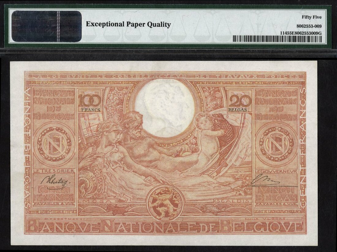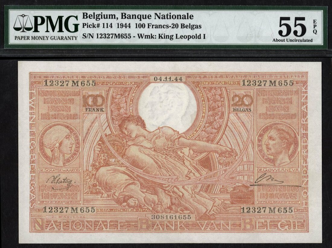 (x) Banque Nationale de Belgique, 100 francs-20 belgas, 1944, serial number 12327M655, (Pick 114), in PMG holder 55 EPQ About Uncirculated