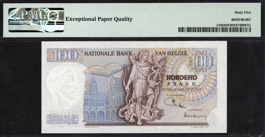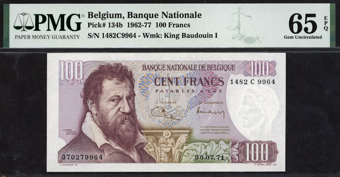 Banque Nationale de Belgique, 100 francs, 1962-77, serial number 1482C9964, (Pick 134b), in PMG holder 65 EPQ Gem Uncirculated