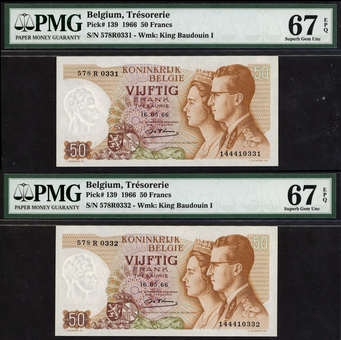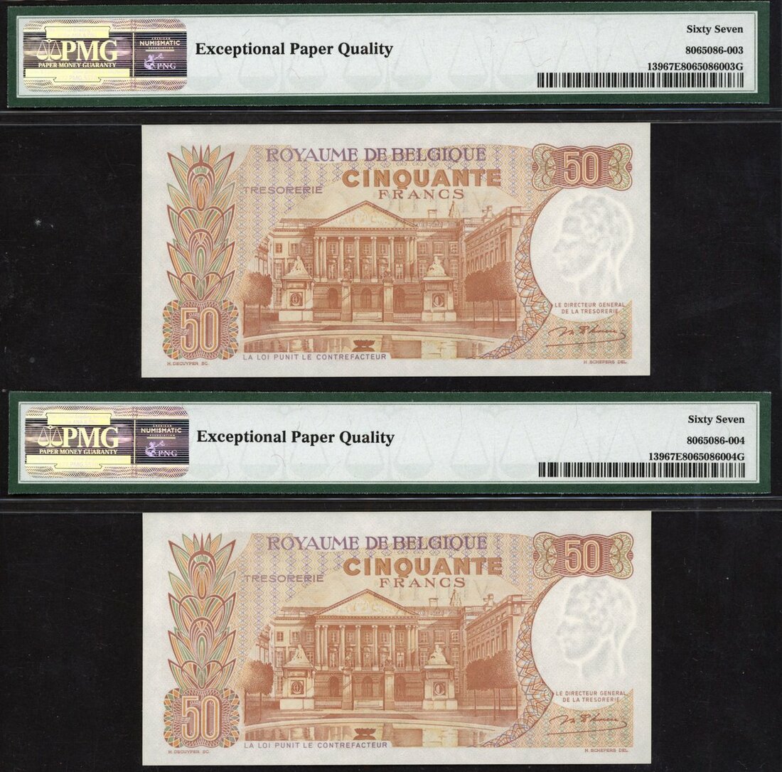 (x) Royaume de Belgique Tresorerie, Belgium, consecutive pair of 50 francs, 1966, (Pick 139), in PMG holders 67 EPQ Superb Gem Unc (2 notes)