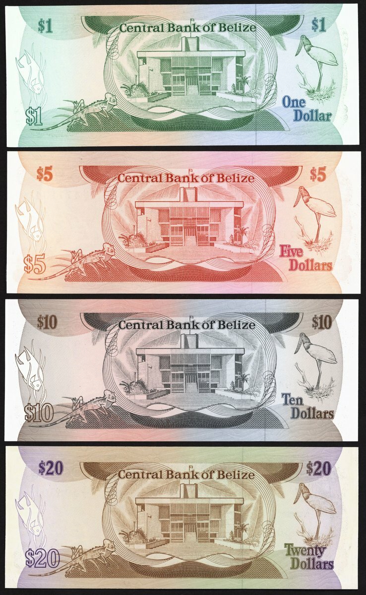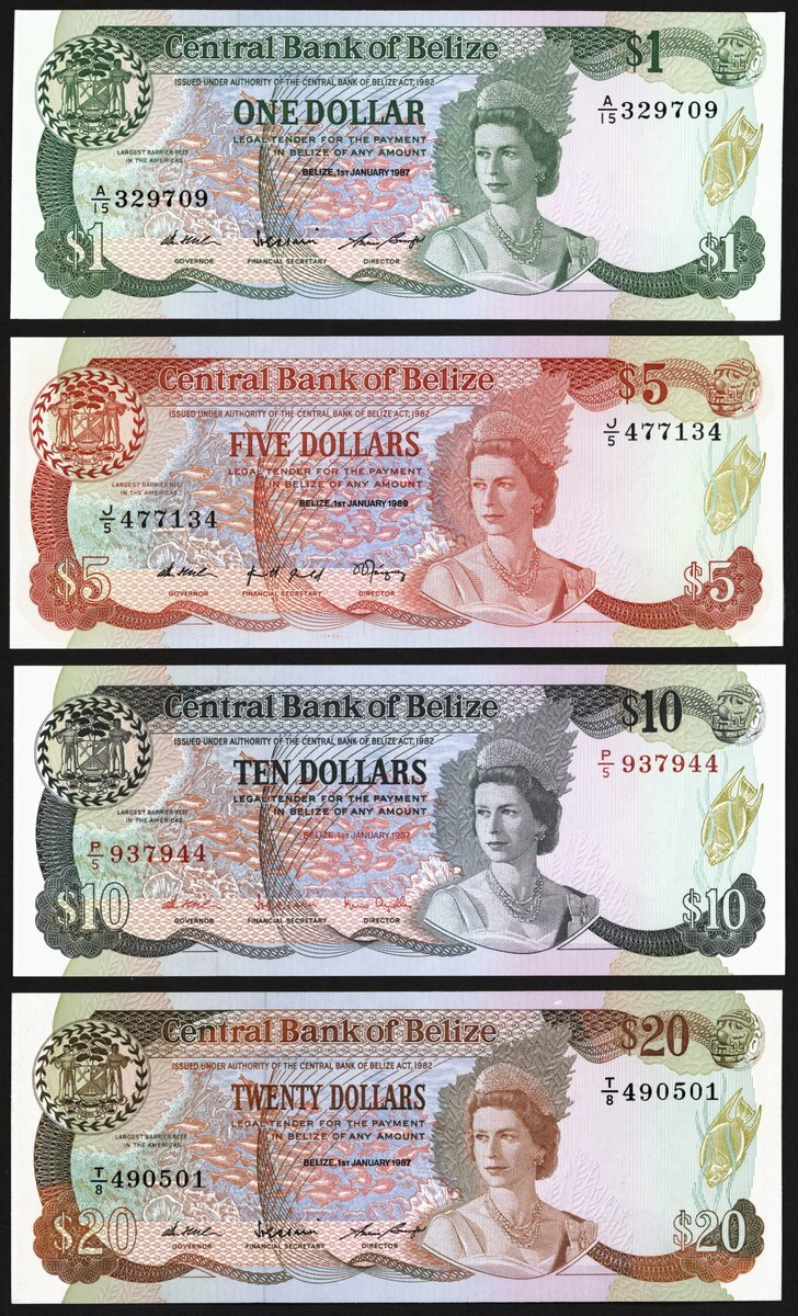 Central Bank of Belize, $1, $5, $10, $20, (1987-89), (Pick 46, 47, 48, 49), all uncirculated, $5 with very minor tape residue (4 notes)