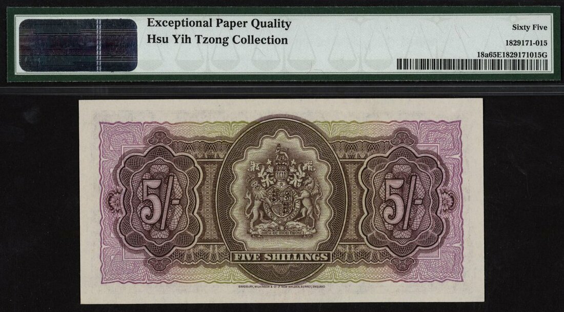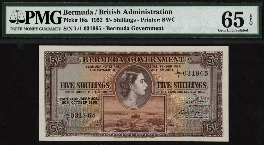 (x) Bermuda Government, 5 shillings, 20 October 1952, serial number L/1 031965, (Pick 18a, TBB B119a), in PMG holder 65 EPQ Gem Uncirculated