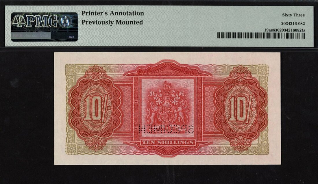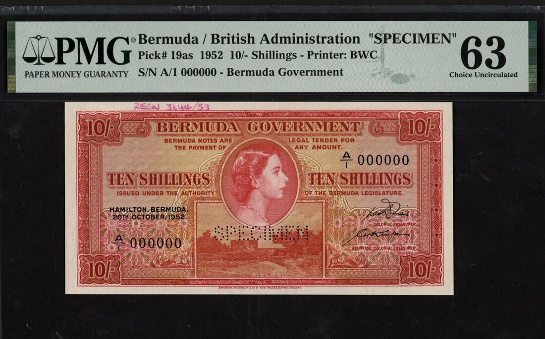 (x) Bermuda Government, specimen 10 shillings, 20 October 1952, serial number A/1 000000, (Pick 19as, TBB B120as), in PMG holder, printer's annotation, previously mounted, 63 Choice Uncirculated, quite scarce
