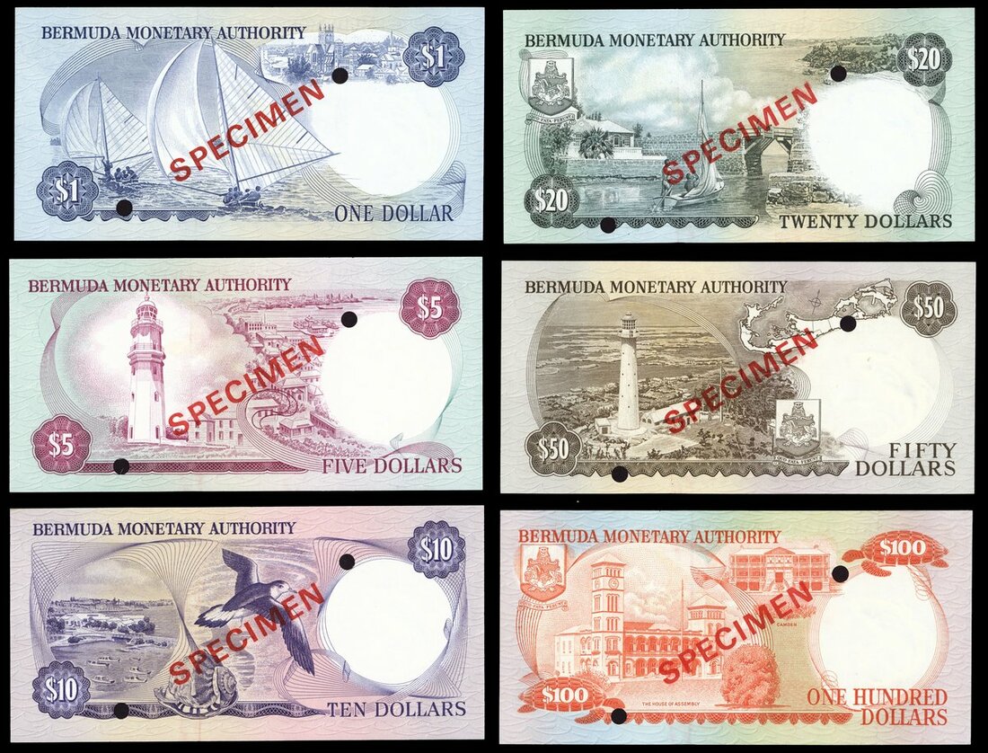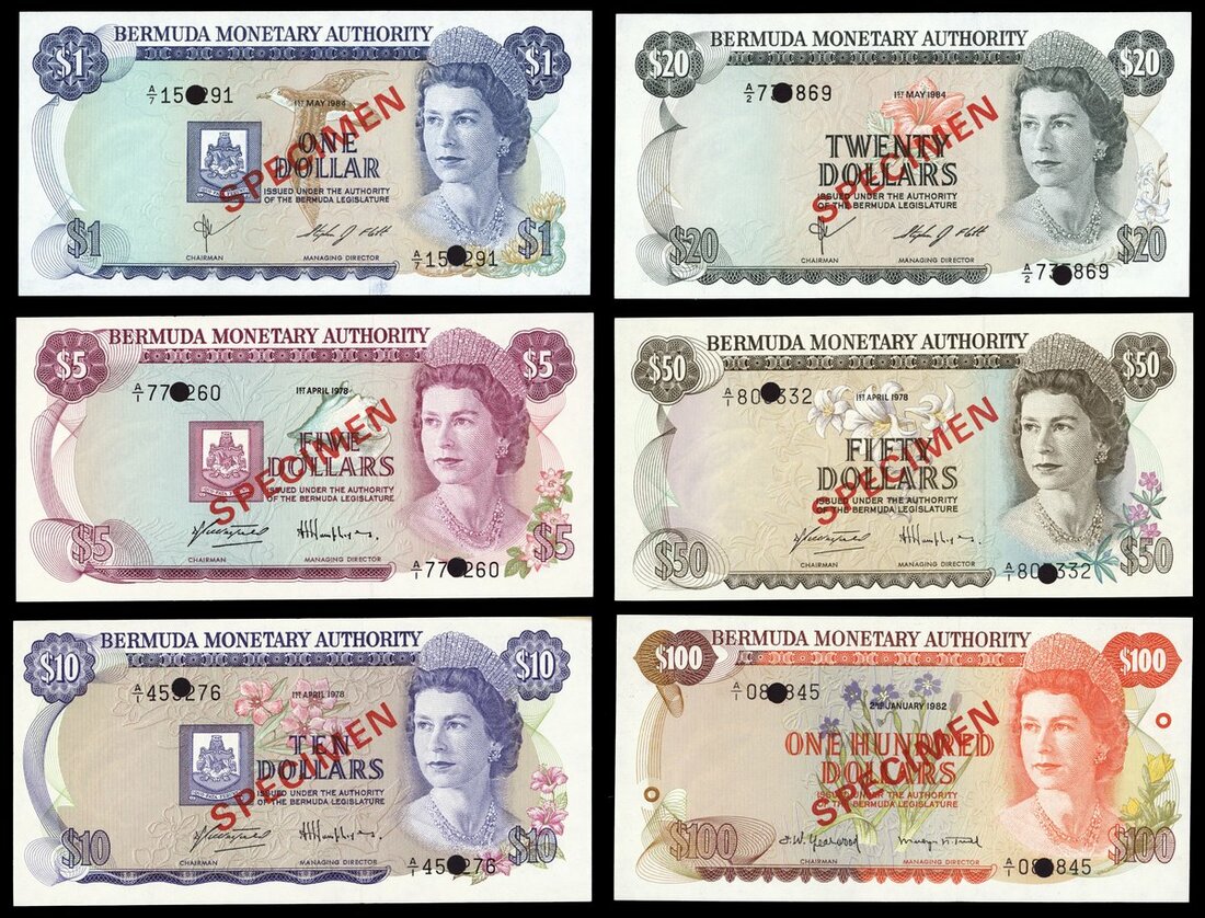 (x) Bermuda Monetary Authority, specimen $5, $10, $20, 1 April 1978, $50, 1 May 1984, $100, January 1982, (Pick 29as, 30as, 31ds, 32as, 33as), all issued serial numbers punched, red SPECIMEN overprint, uncirculated (5 notes)