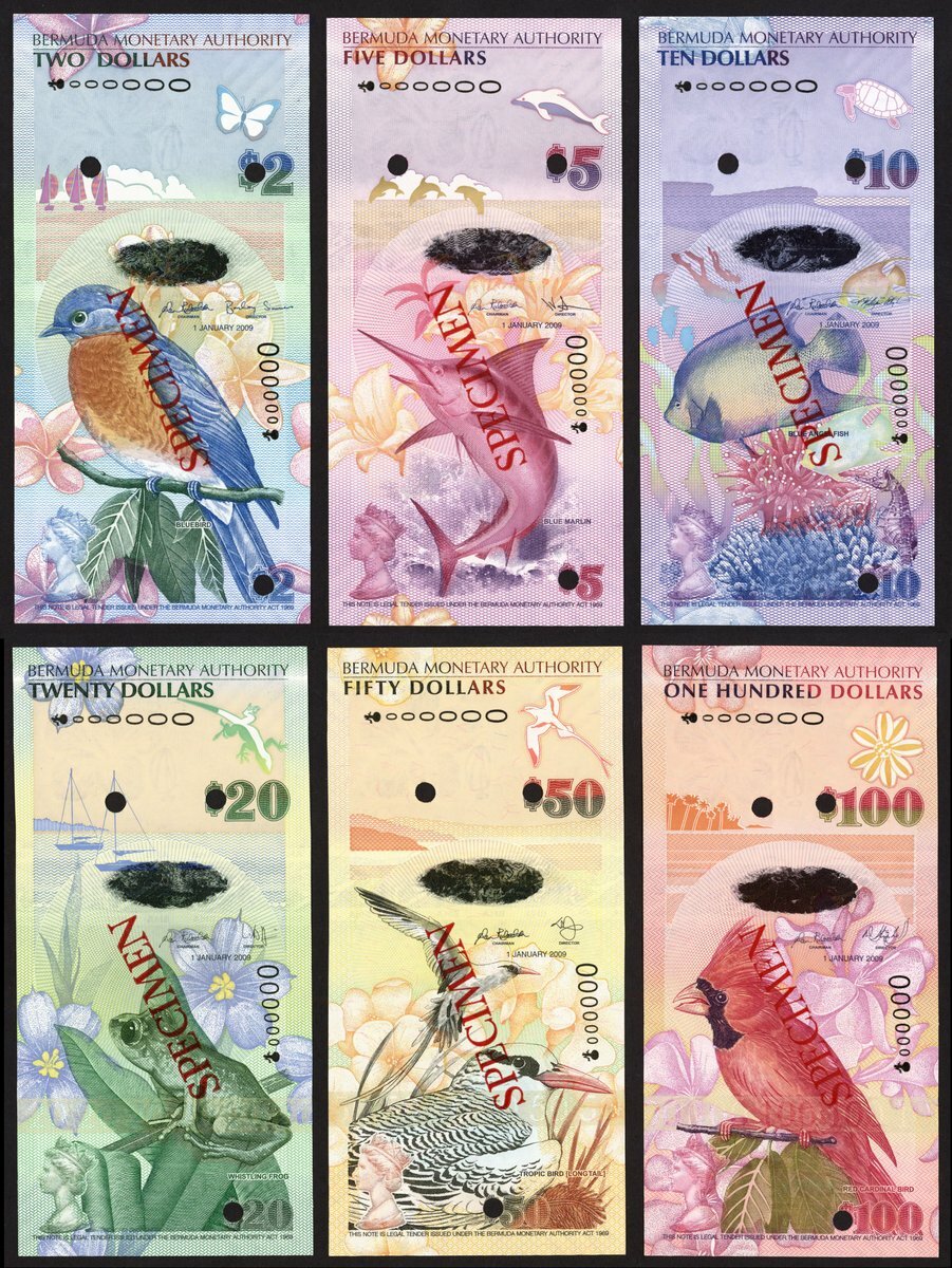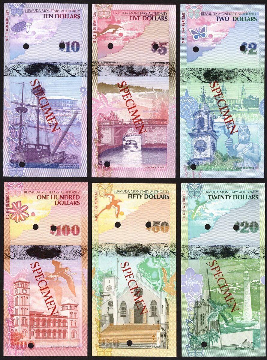 (x) Bermuda Monetary Authority, a specimen set from 2009, including $2, $5, $10, $20, $50, $100, (Pick 57s-62s, TBB B230s-B235s), perforated, uncirculated (6 notes)