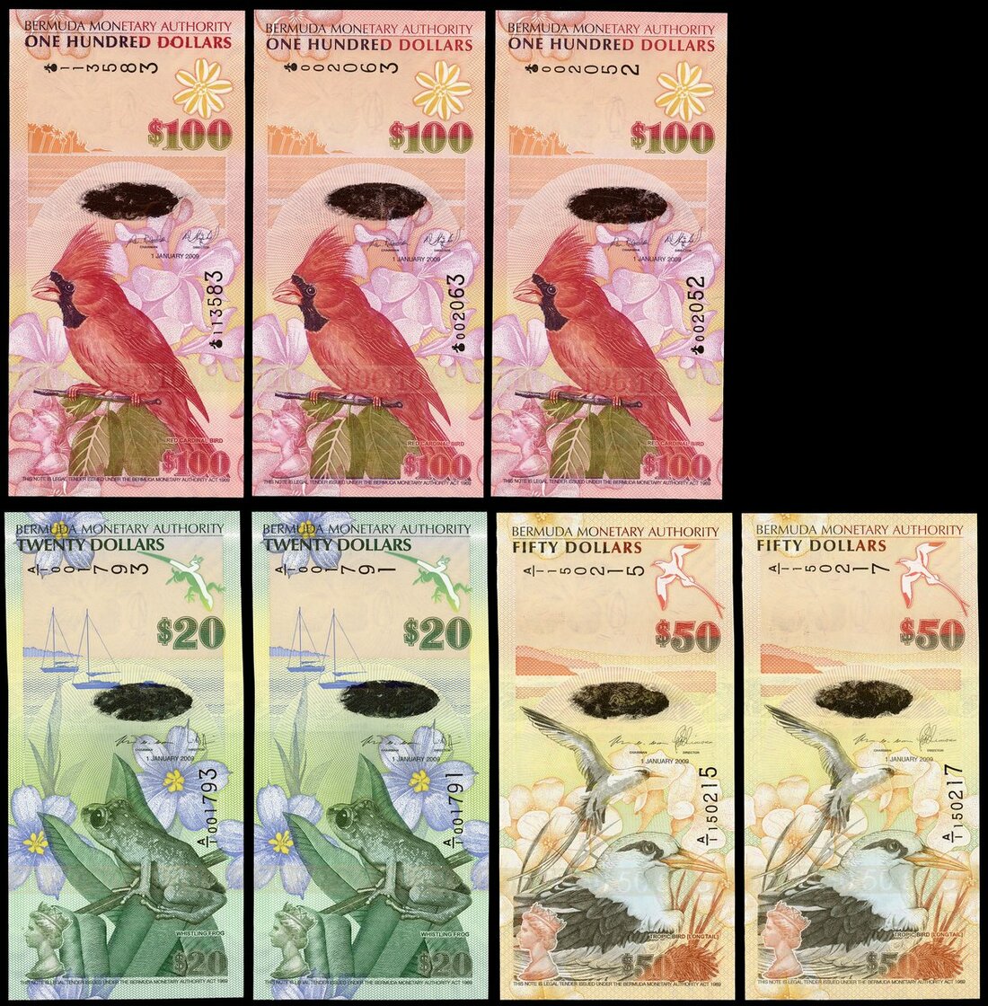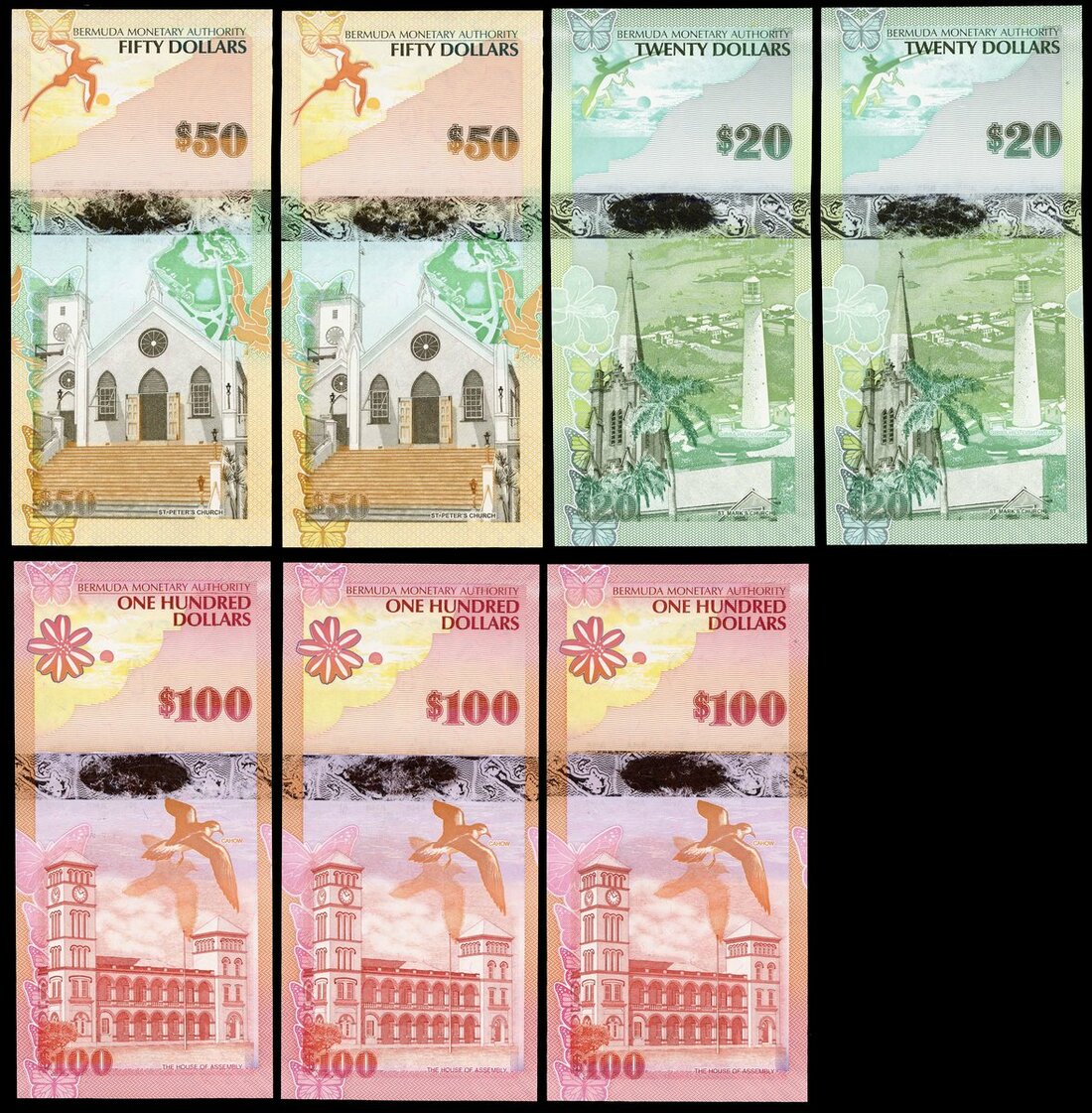(x) Bermuda Monetary Authority, $20 (2), $50 (2), $100 (3), 2009 (Pick 60, 61, 62), uncirculated (7 notes)