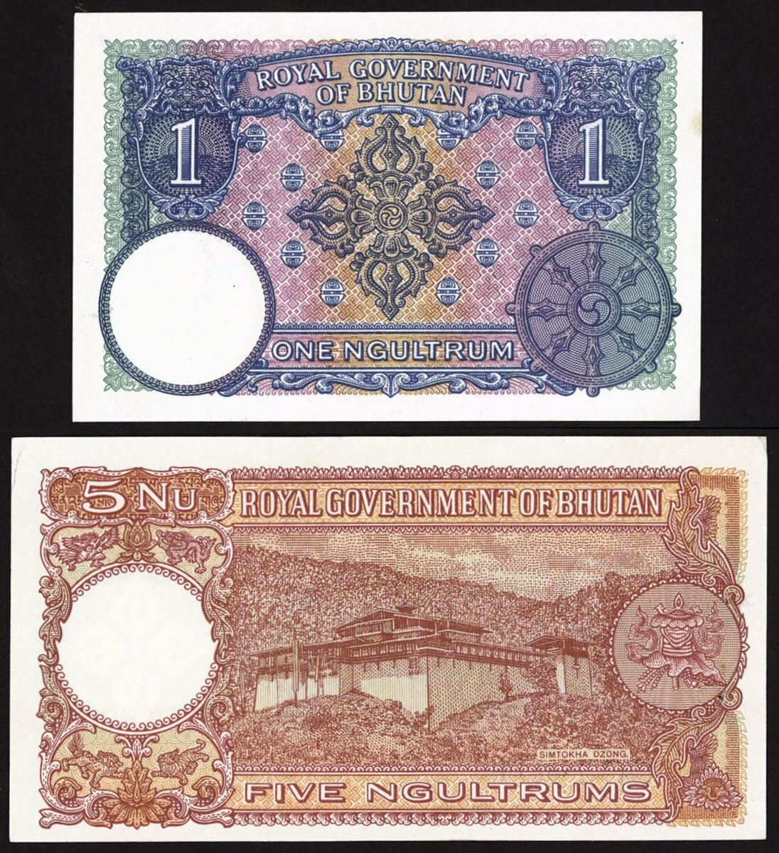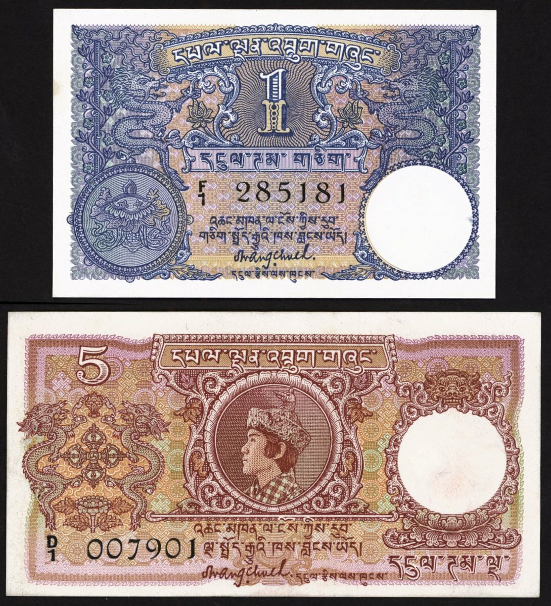 Royal Government of Bhutan, 5 ngultrums, ND 1974, serial number 007901, also 1 ngultrum serial number 285181