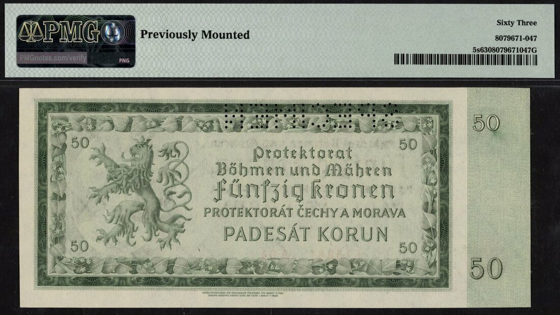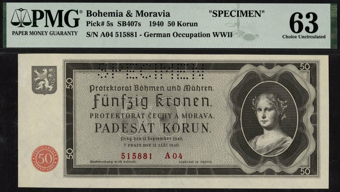 Bohemia & Moravia, specimen 50 korun, 1940, serial number A04 515881, (Pick 5s, TBB B105as), in PMG holder 63 Choice Uncirculated, previously mounted, scarce