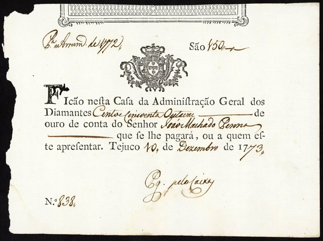 (x) Brazil, Portuguese Administration, various amounts, 1773, serial number 838, (Pick A101), uneven margin at left, hole at left, generally extremely fine