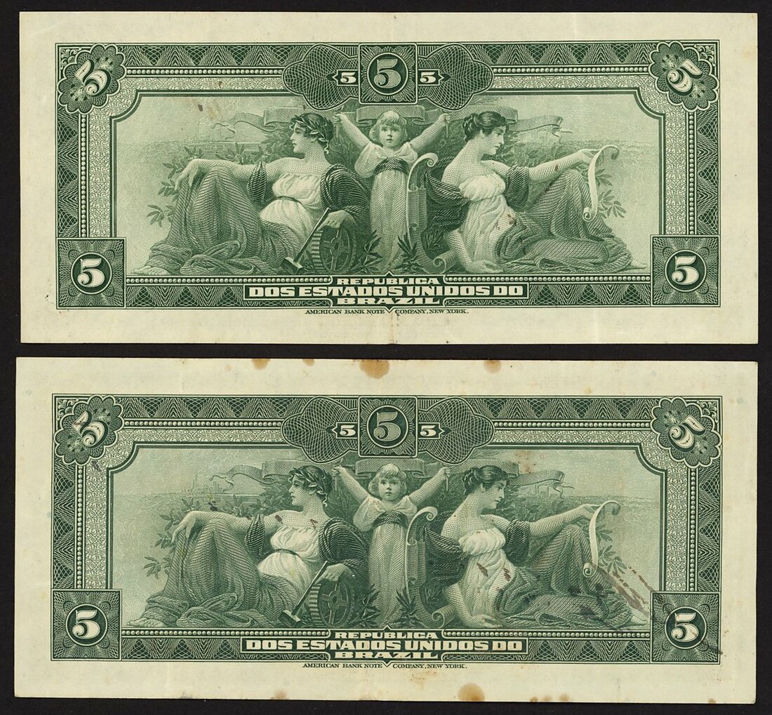 (x) Republica dos Estados Unidos do Brazil, 5 mil reis (2), ND (1913), (Pick 24), one with stain at margins, both very fine (2 notes)