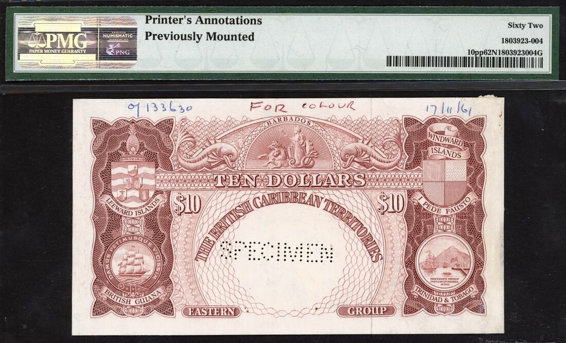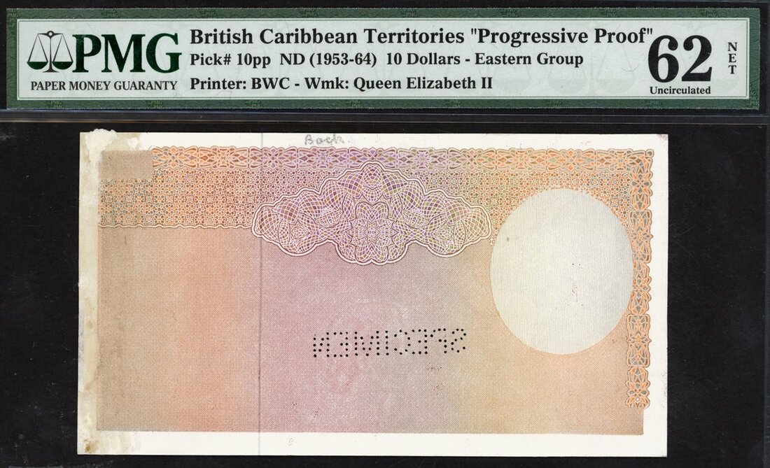 (x) British Caribbean Territories, progressive proof for a 10 dollars, ND (1953-64), obverse with underprint only, reverse fully printed