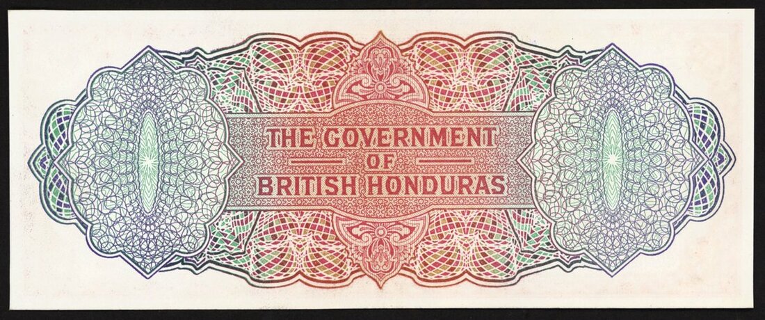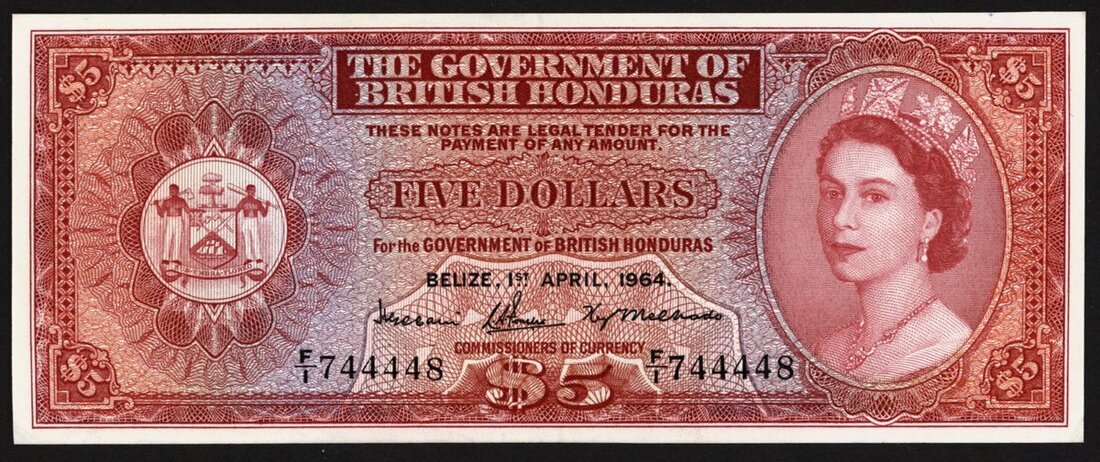 The Government of British Honduras, $5, 1 April 1964, serial number F/1 744448, Elizabeth II at right