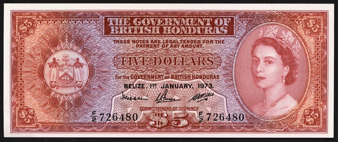 The Government of British Honduras, $5, 1973, serial number F/2 726480, (Pick 30c), uncirculated