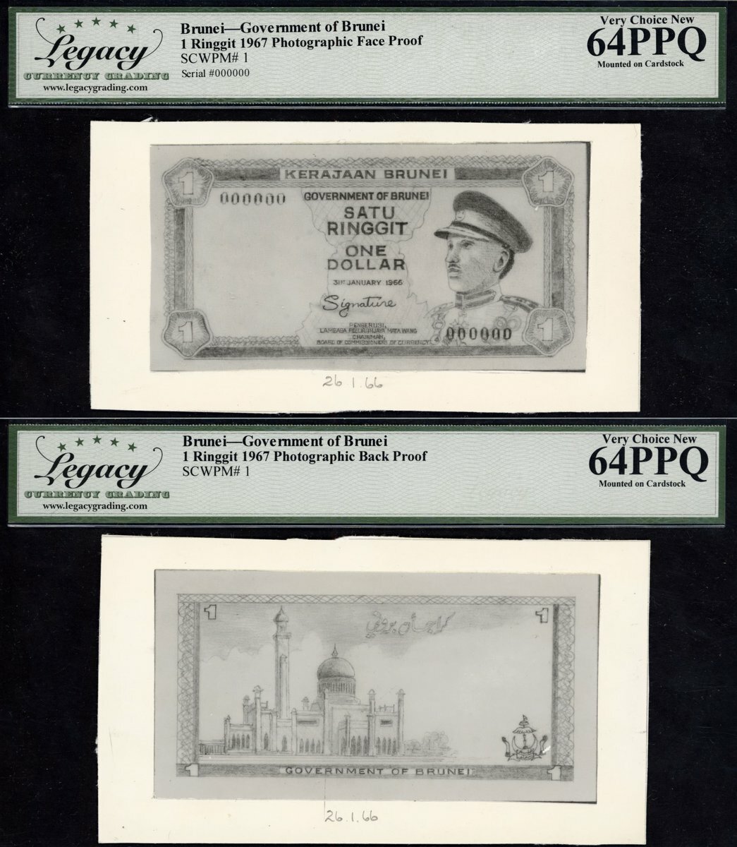 (x) Government of Brunei, obverse and reverse archival photographs for 1 ringgit, 1967, minor differences with issued design including the date, and signature changed to the Sultan's on the issued note,