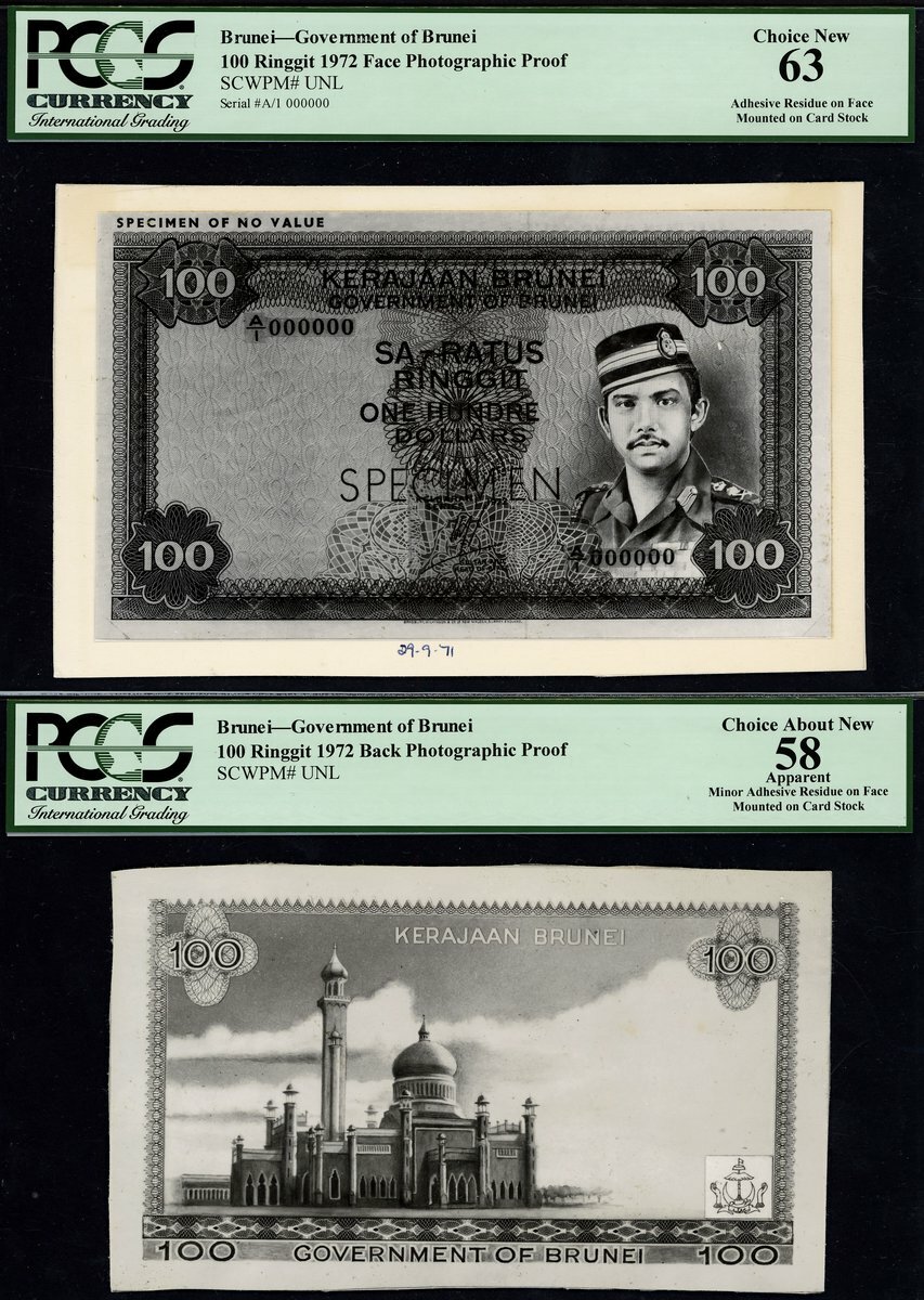 (x) Government of Brunei, archival photographs for an unissued design of 100 ringgit, ND (1972), Sultan Hassanal Bolkiah (different uniform as issued design) at right, letter 'D' missing in 'One Hundred', also title of the signature is different, reverse with Malay text at top margin instead of Arabic text on the issued notes,
