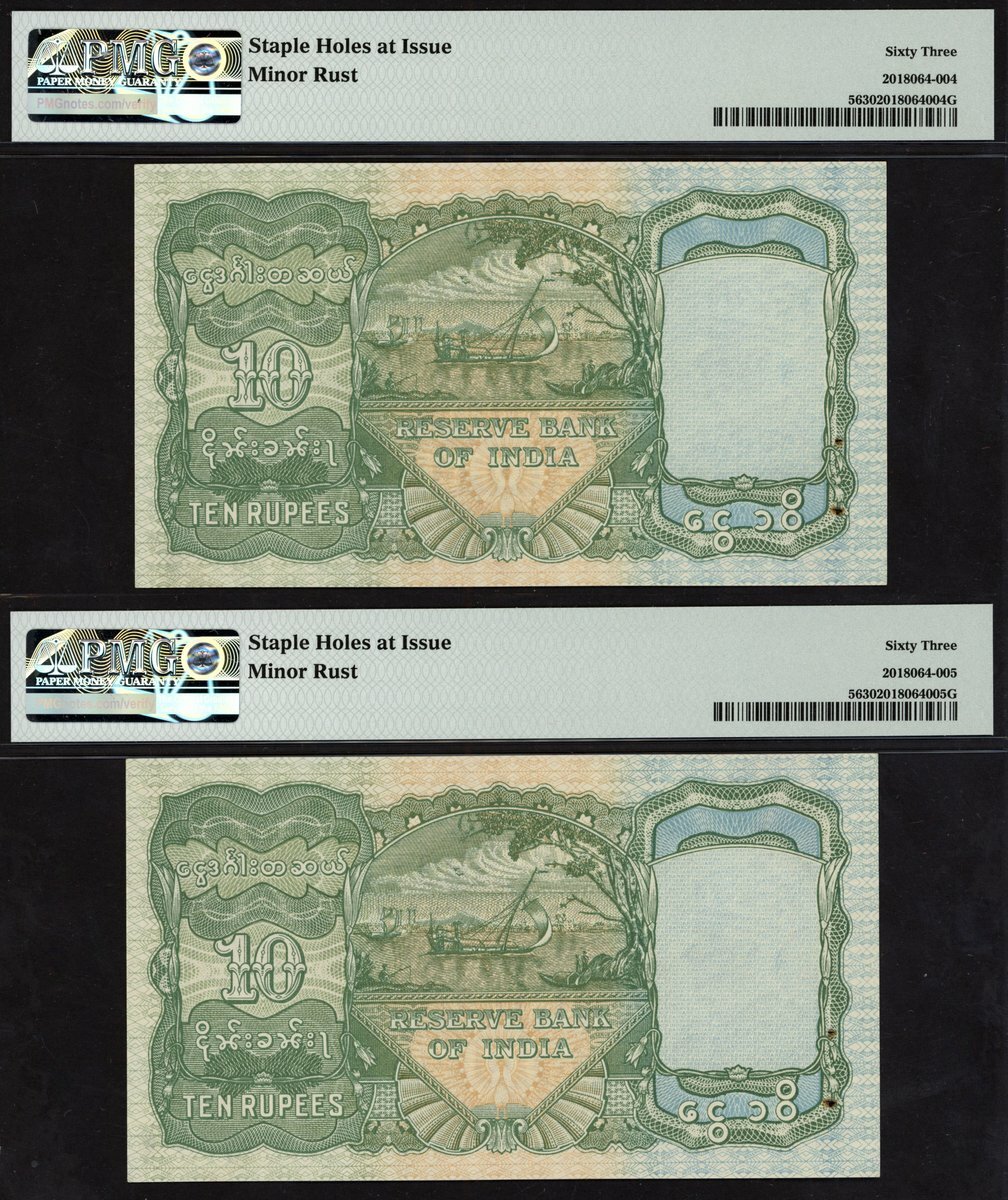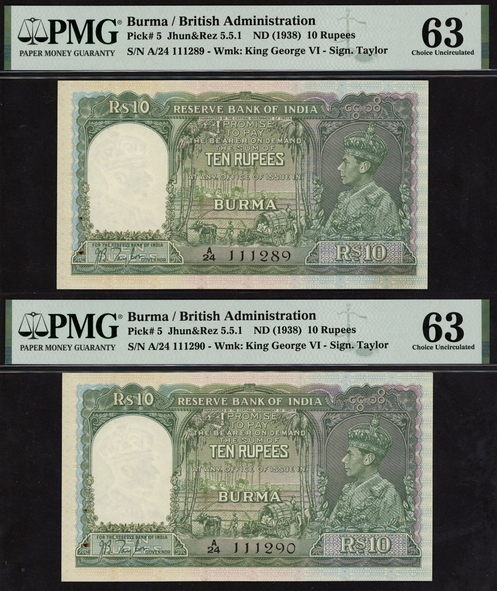 (x) Reserve Bank of India, Burma, consecutive pair of 10 rupees, ND (1938), serial number A/24 111289/90, (Pick 5, TBB B202), in PMG holders, staple holes at issue, minor rust, 63 Choice Uncirculated. Quite scarce in high grade (2 notes)