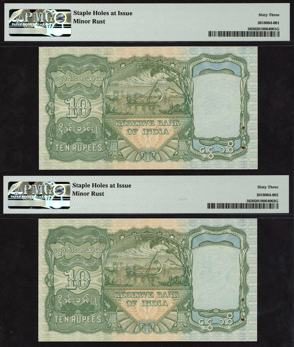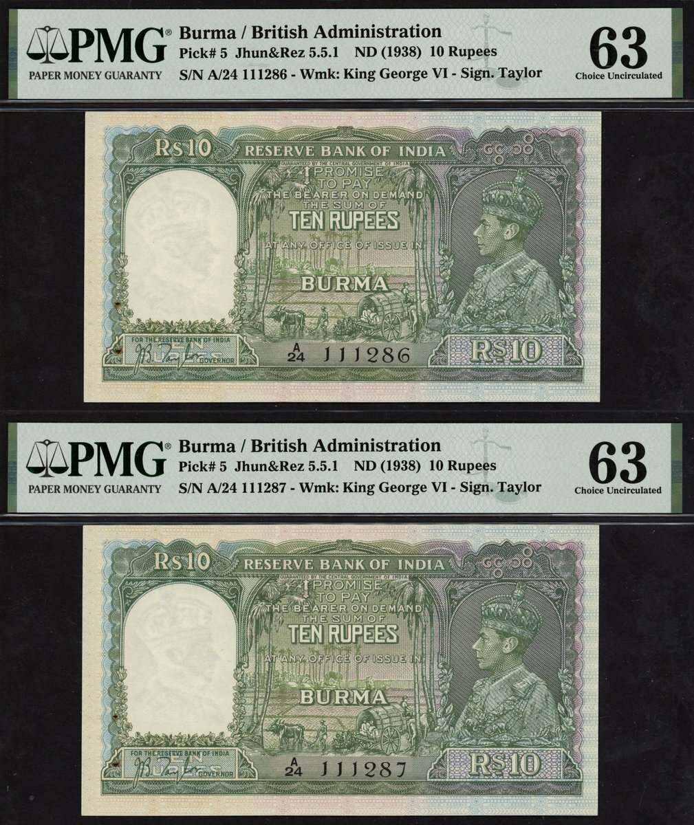 (x) Reserve Bank of India, Burma, consecutive pair of 10 rupees, ND (1938), serial number A/24 111286/7, (Pick 5, TBB B202), in PMG holders, staple holes at issue, minor rust, 63 Choice Uncirculated. Quite scarce in high grade (2 notes)