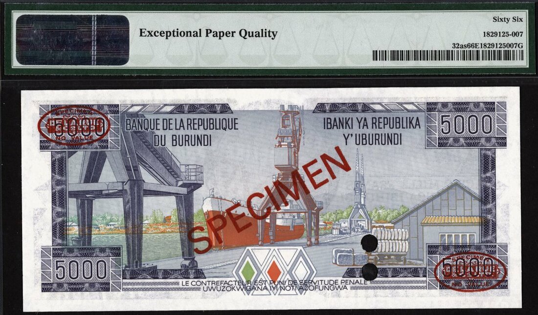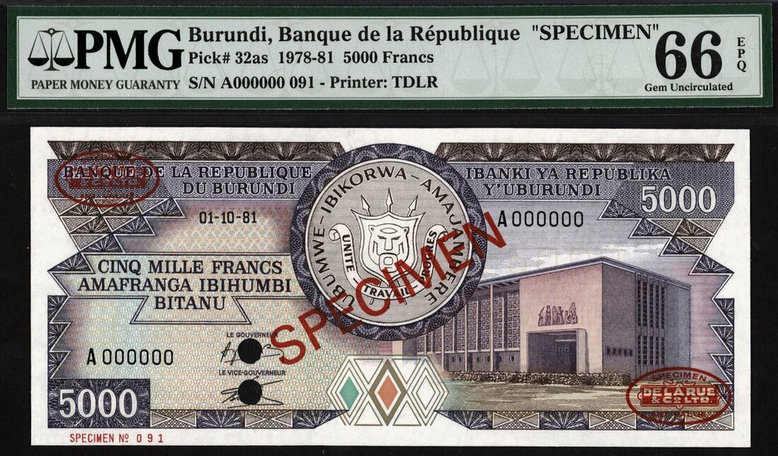 Banque de la Republique du Burundi, specimen 5000 francs, 1 October 1981, serial number 000000, (Pick 32as, TBB B), in PMG holder 66 EPQ Gem Uncirculated