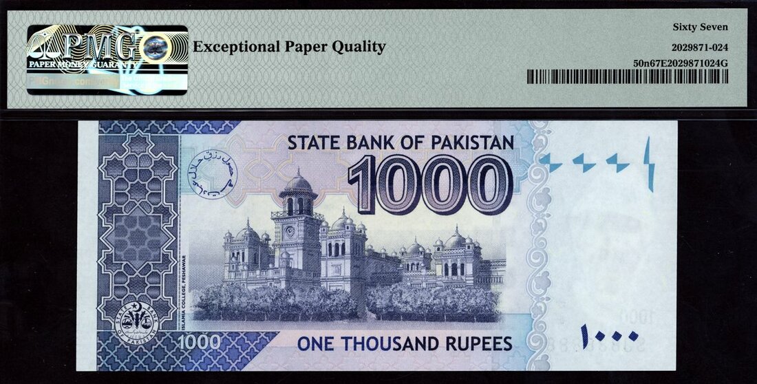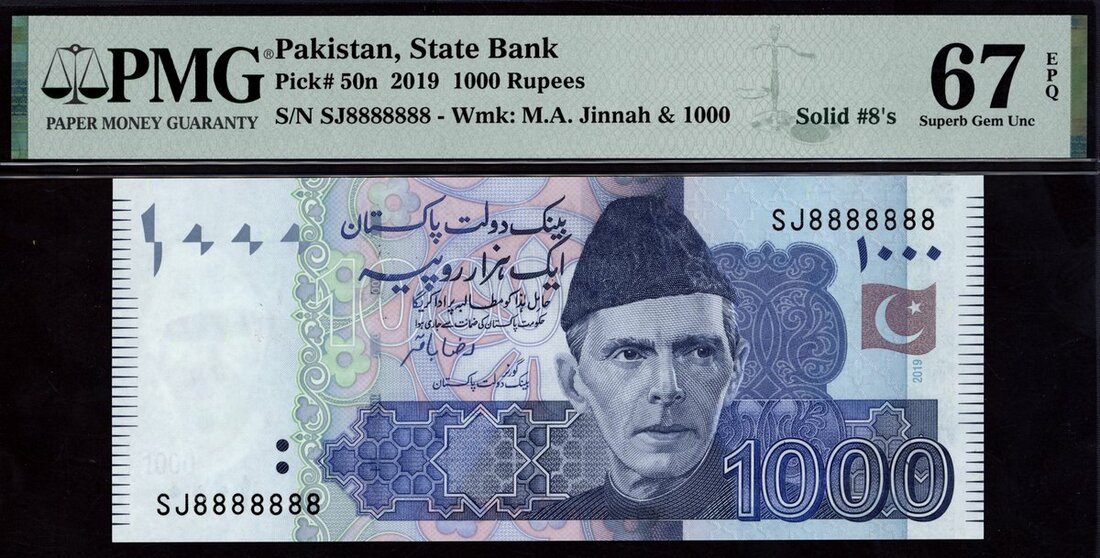 State Bank of Pakistan, 1000 rupees, 2019, solid serial number SJ8888888, (Pick 50n), in PMG holder 67 EPQ Superb Gem Unc