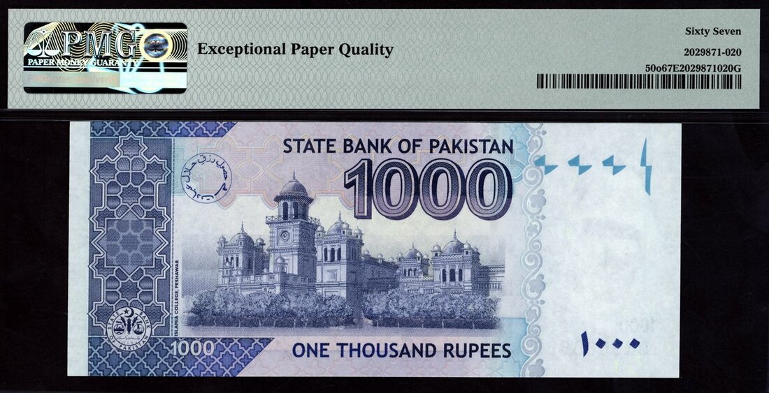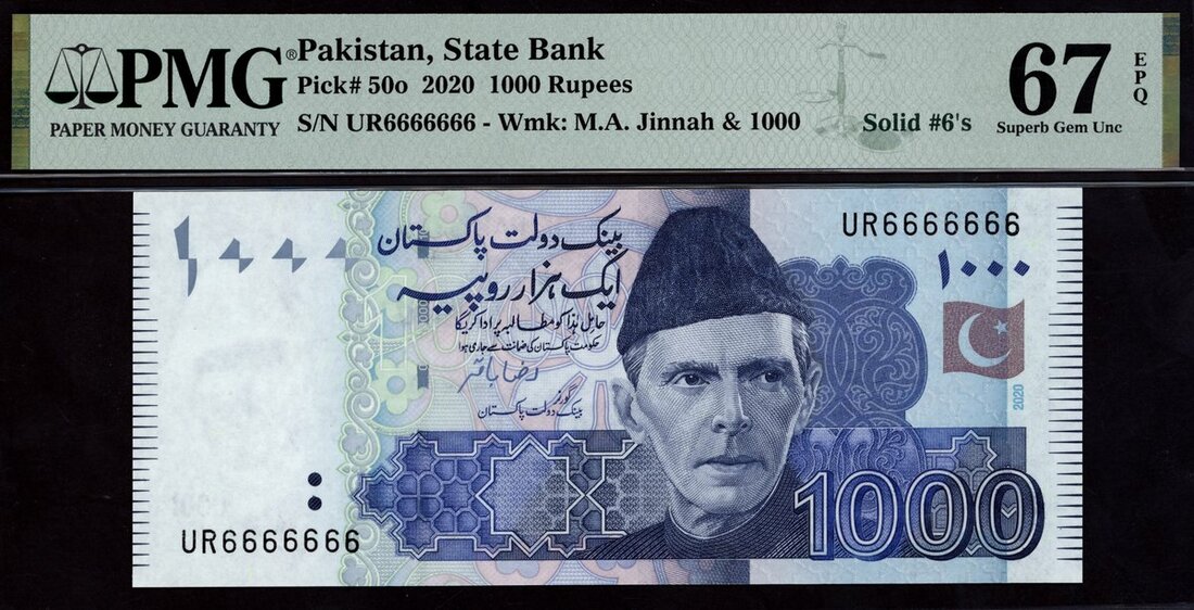 State Bank of Pakistan, [Top Pop] 1000 rupees, 2020, solid serial number UR6666666, (Pick 50o), in PMG holder 67 EPQ Superb Gem Unc. One of three top pop example