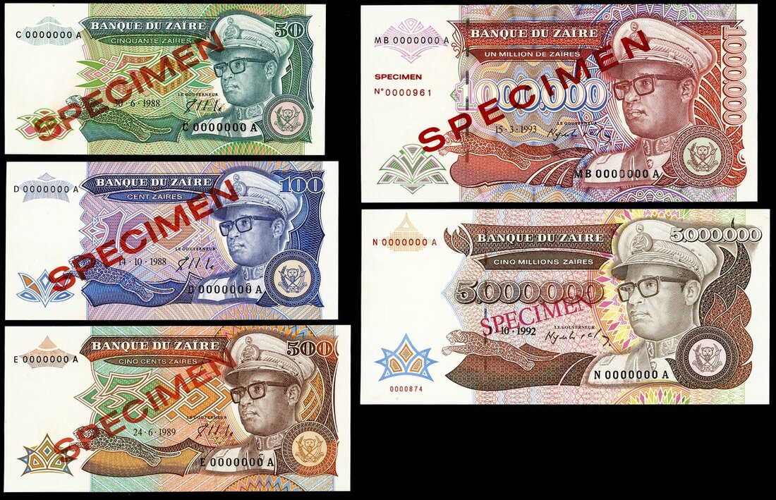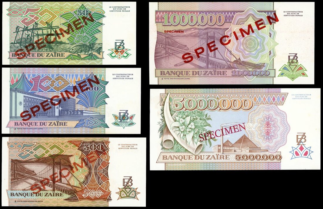 (x) Banque du Zaire, a group of 1988-1993 issues specimen, including 50, 100, 500, 1 million and 5 million zaires,