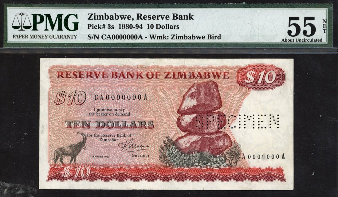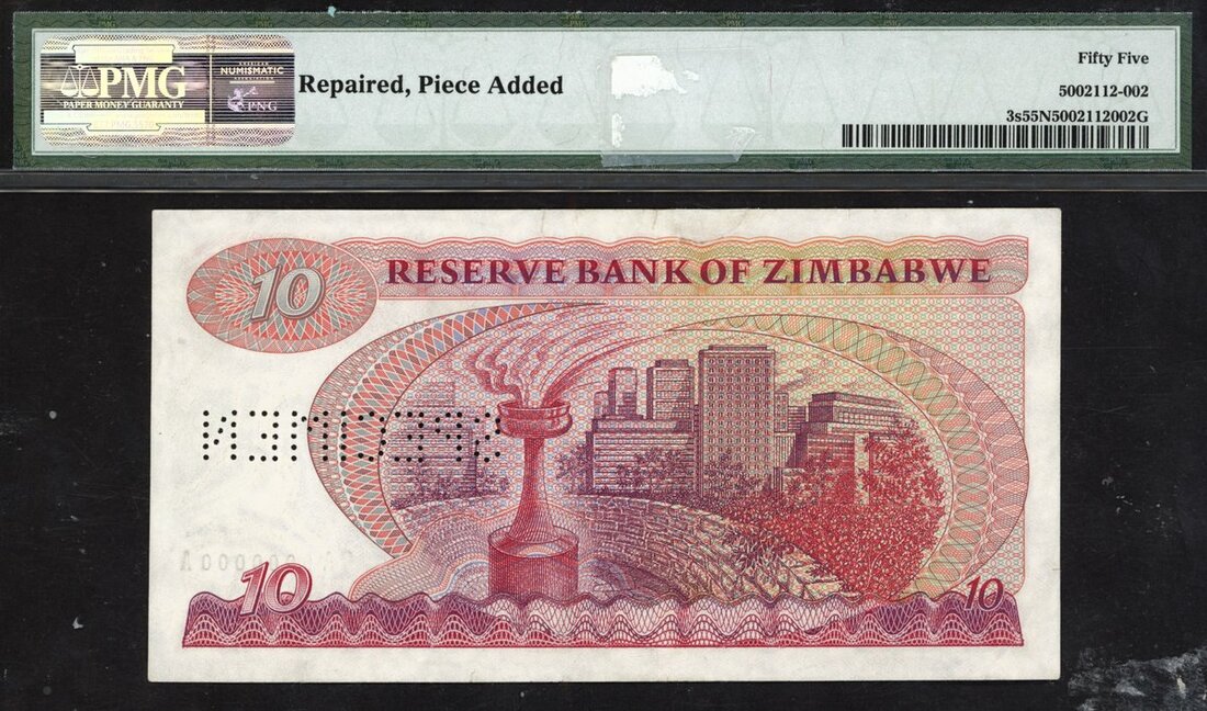 (x) Reserve Bank of Zimbabwe, specimen 10 dollars, 1980-84, (Pick 3s, TBB B103s), in PMG holder, repaired, piece added, 55 NET About Uncirculated