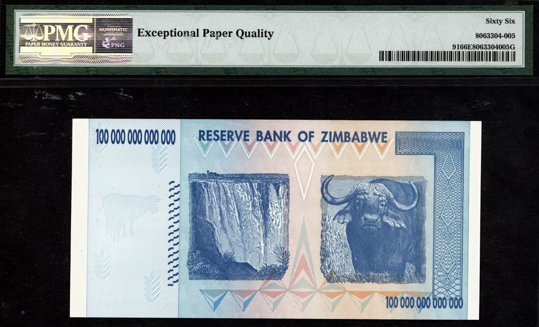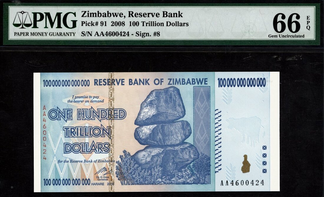 (x) Reserve Bank of Zimbabwe, 100 trillion dollars, 2008, serial number AA4600424, (Pick 91), in PMG holder 66 EPQ Gem Uncirculated