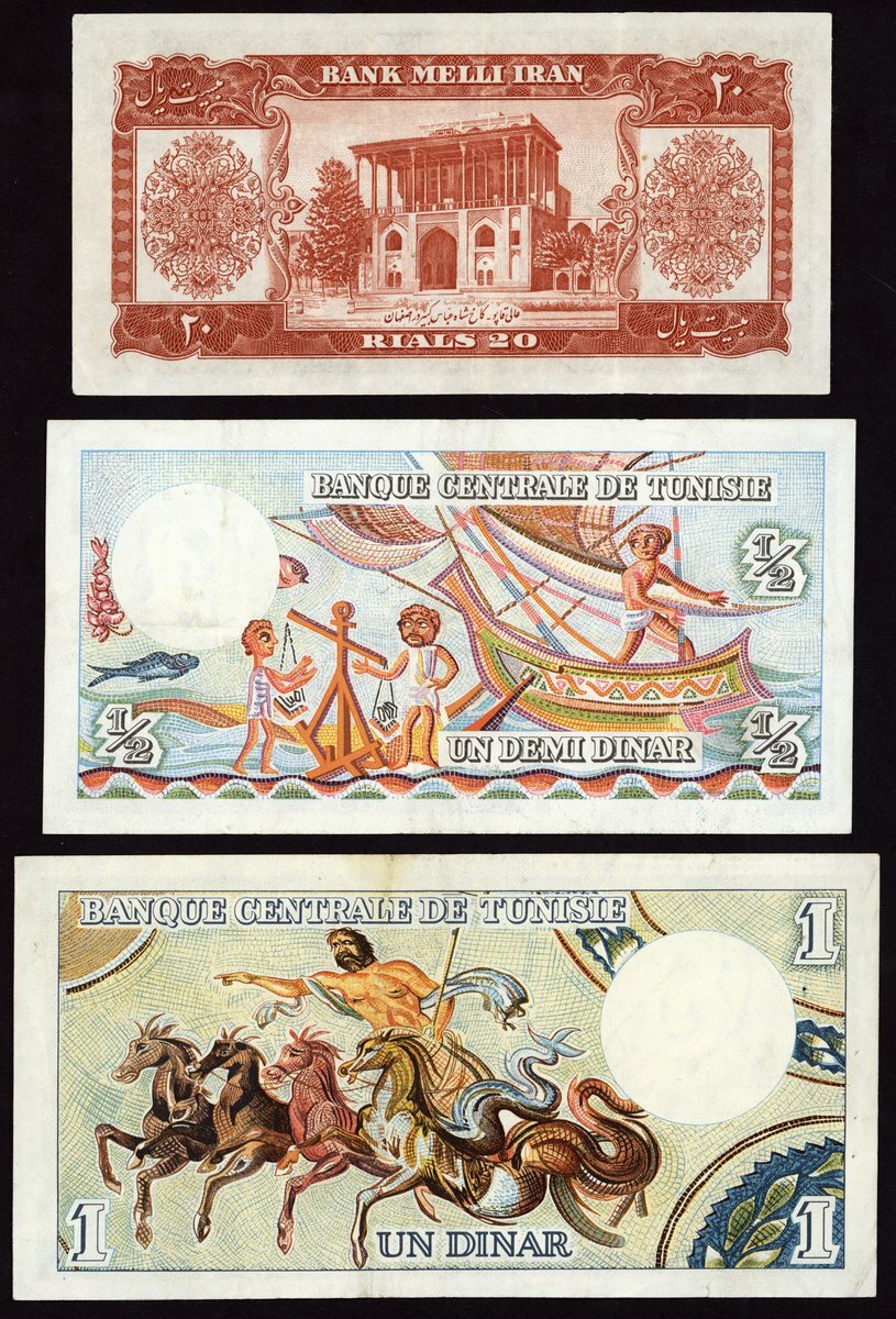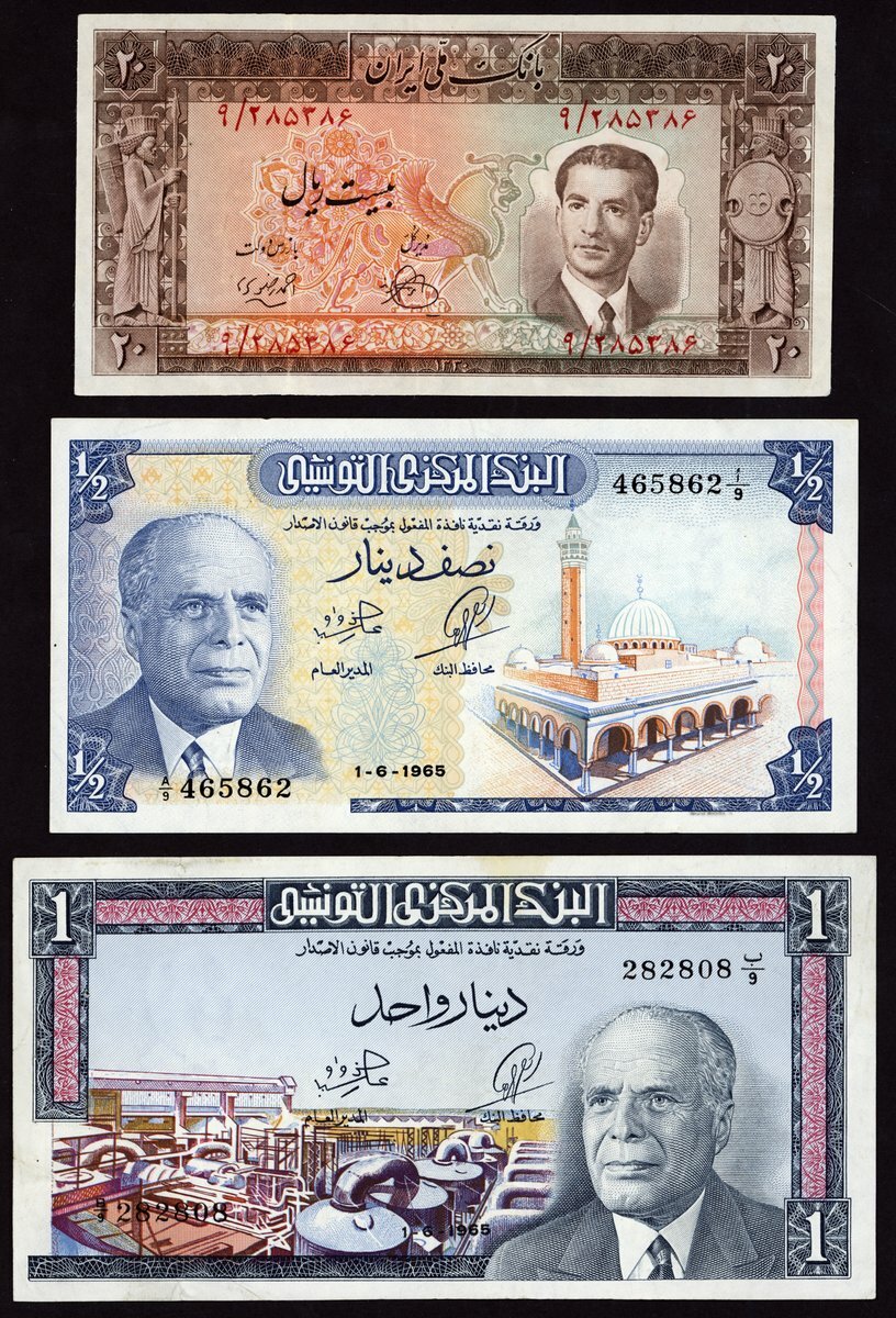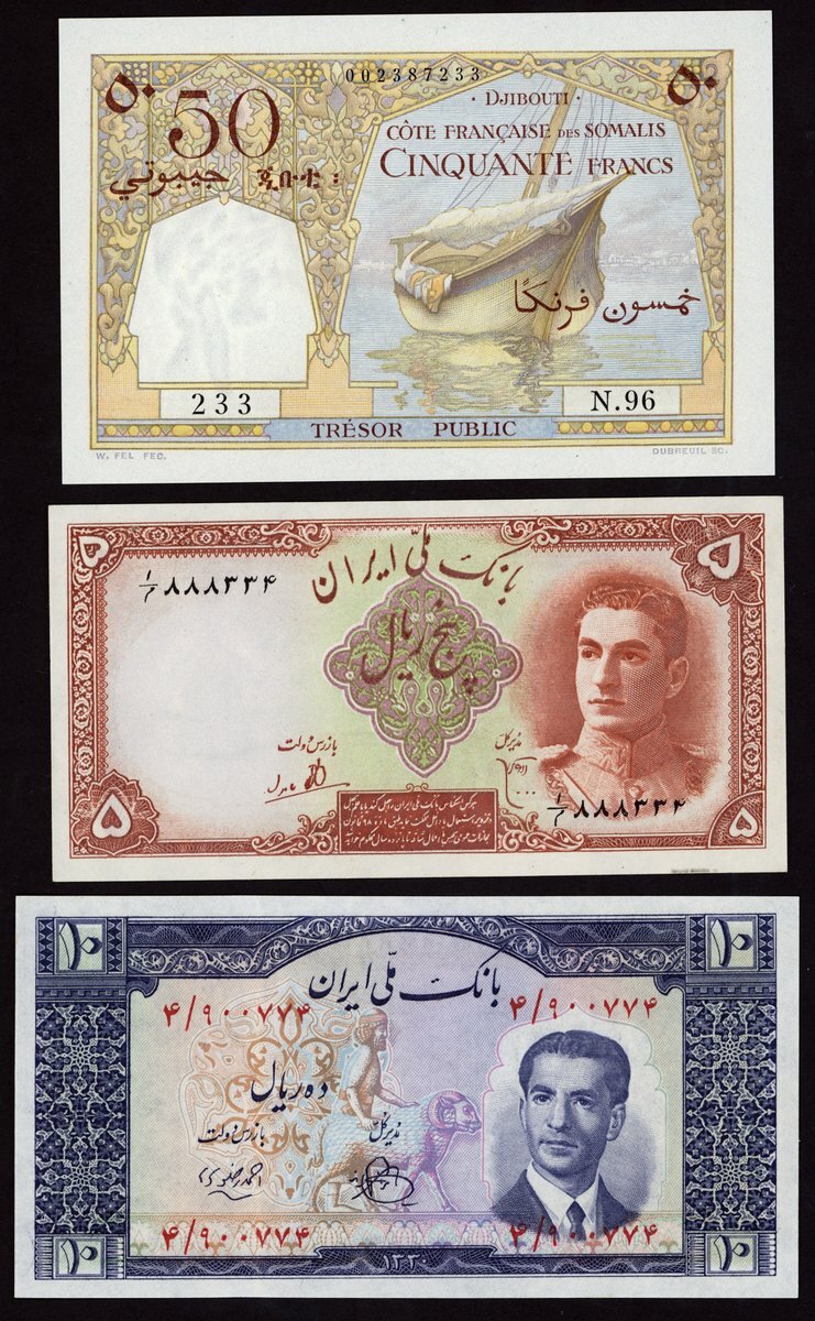 A group of Africa and Middle East banknotes, including Burundi 5 and 10 francs 1965, Congo 20 francs 1962, French Somaliland 50 francs 1952, Iran 5 rials 1944, 10 and 20 rials 1953, Tunisia 1/2 and 1 dirham 1965, West African States (Senegal) 100 francs 1961,