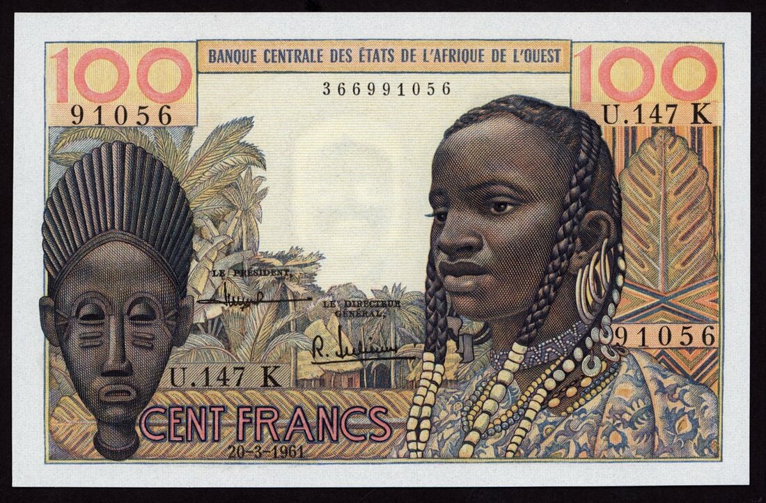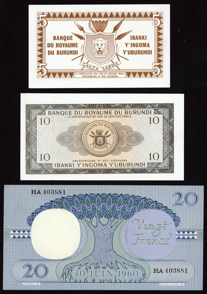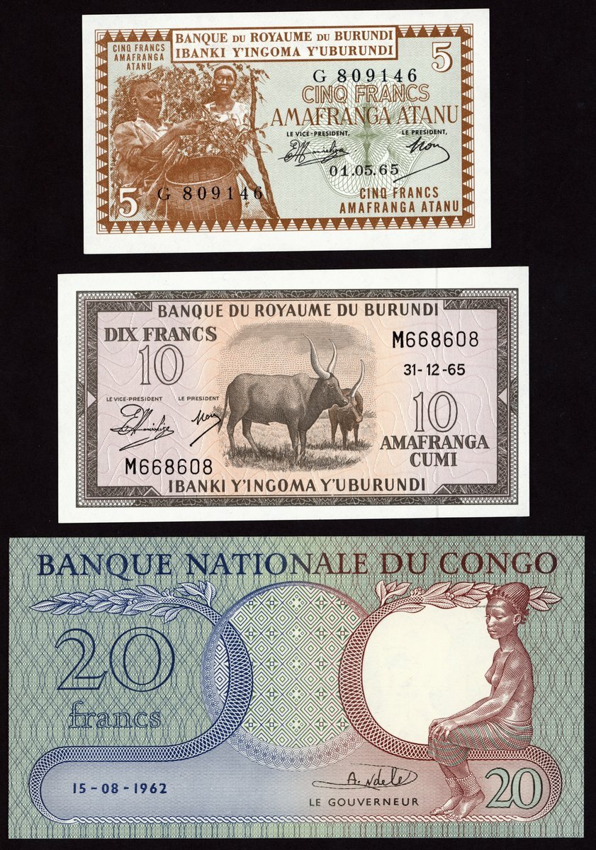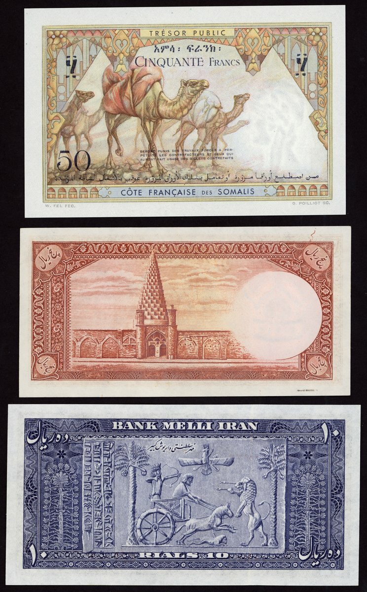 A group of Africa and Middle East banknotes, including Burundi 5 and 10 francs 1965, Congo 20 francs 1962, French Somaliland 50 francs 1952, Iran 5 rials 1944, 10 and 20 rials 1953, Tunisia 1/2 and 1 dirham 1965, West African States (Senegal) 100 francs 1961,
