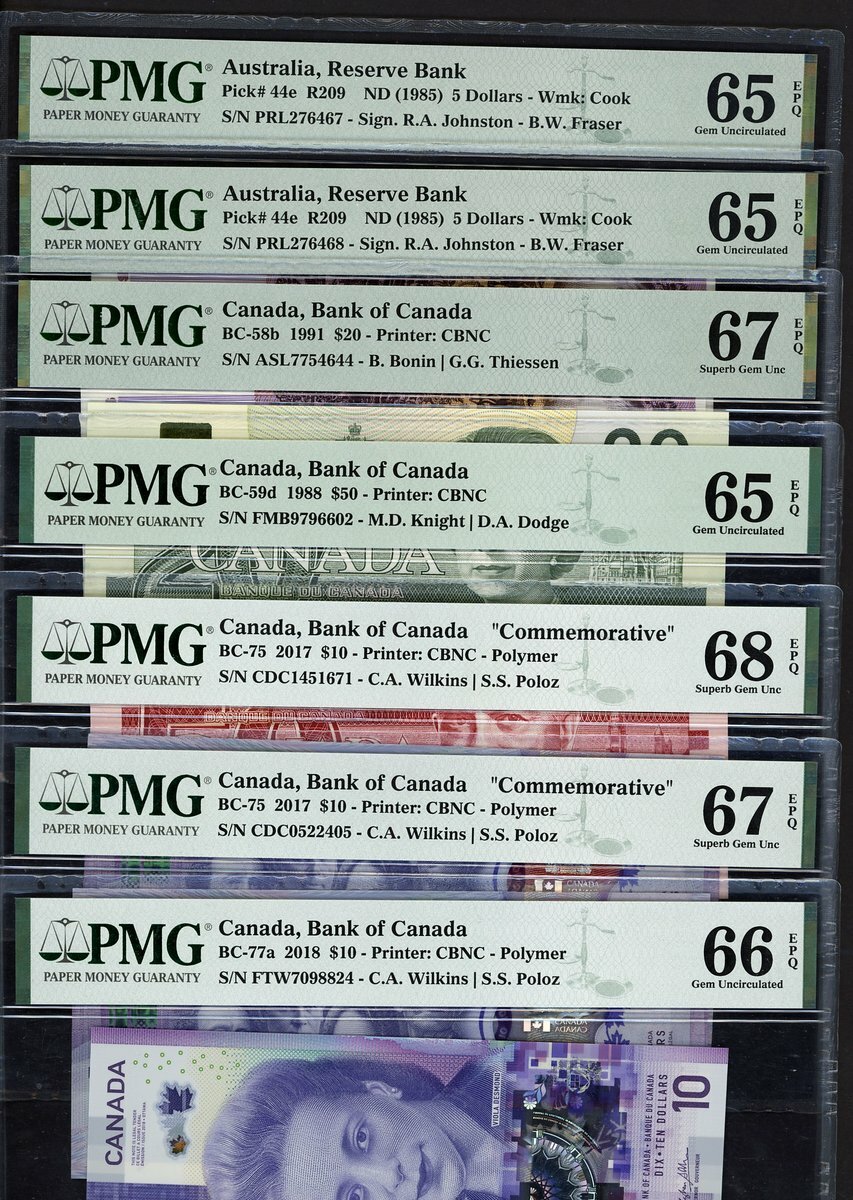 (x) A group of graded Commonwealth banknotes, including Australia 5 dollars (2) 1985, Canada $20 1991, $50 1988, Canada $10 (2) 2017, $10 2018,