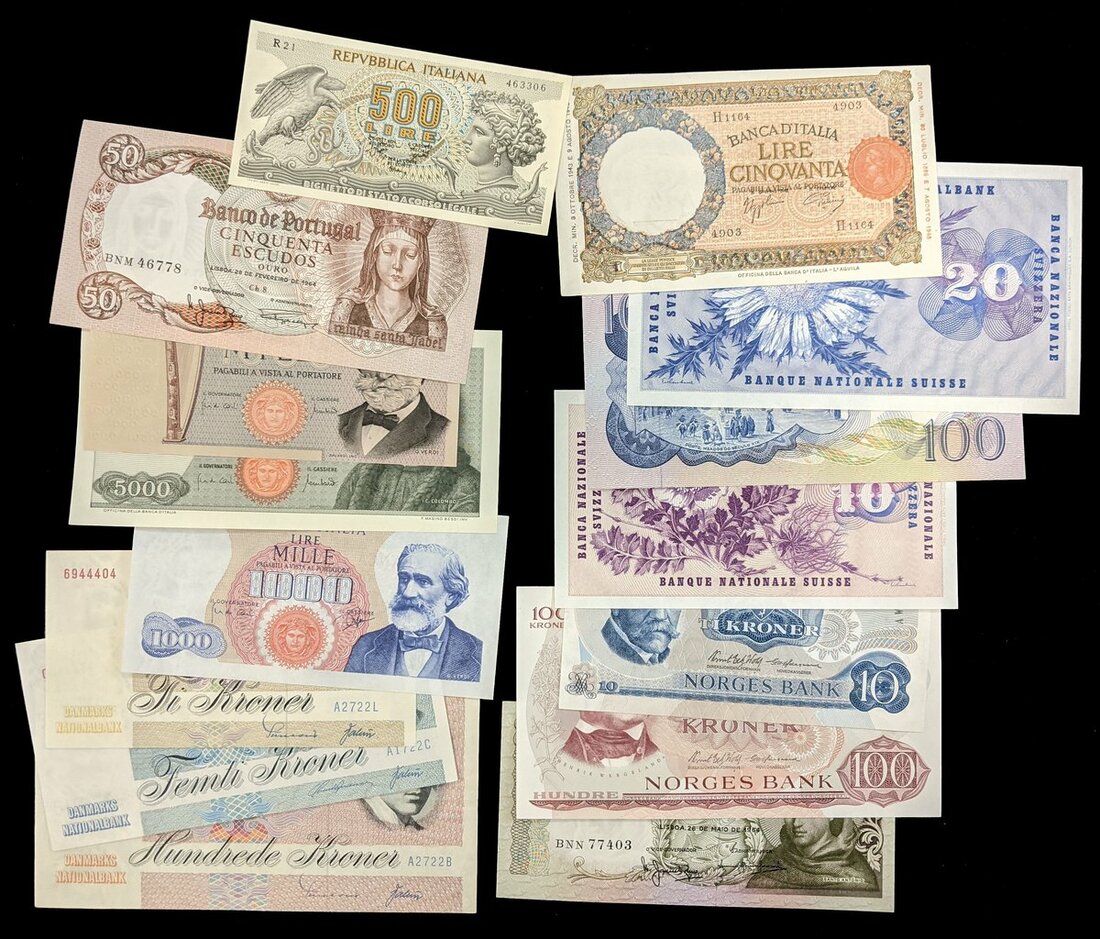 A group of European banknotes, including Denmark 10, 50 and 100 kroner 1972, Italy 50 lire 1943, 500 lire 1966, 1000 lire 1962, 5000 lire 1964, 1000 lire 1969, Norway 10 and 100 kroner 1967, Portugal 20, 50 and 100 escudos 1964, Switzerland 10 and 20 francs 1969-71,