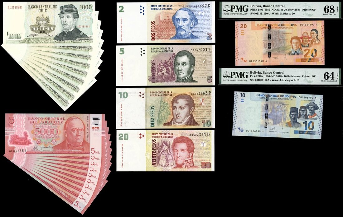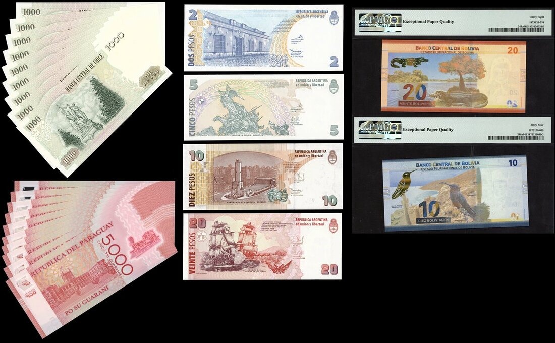 (x) A group of South American banknotes, including Argentina (4), Bolivia (2), Chile (9), Paraguay (10),