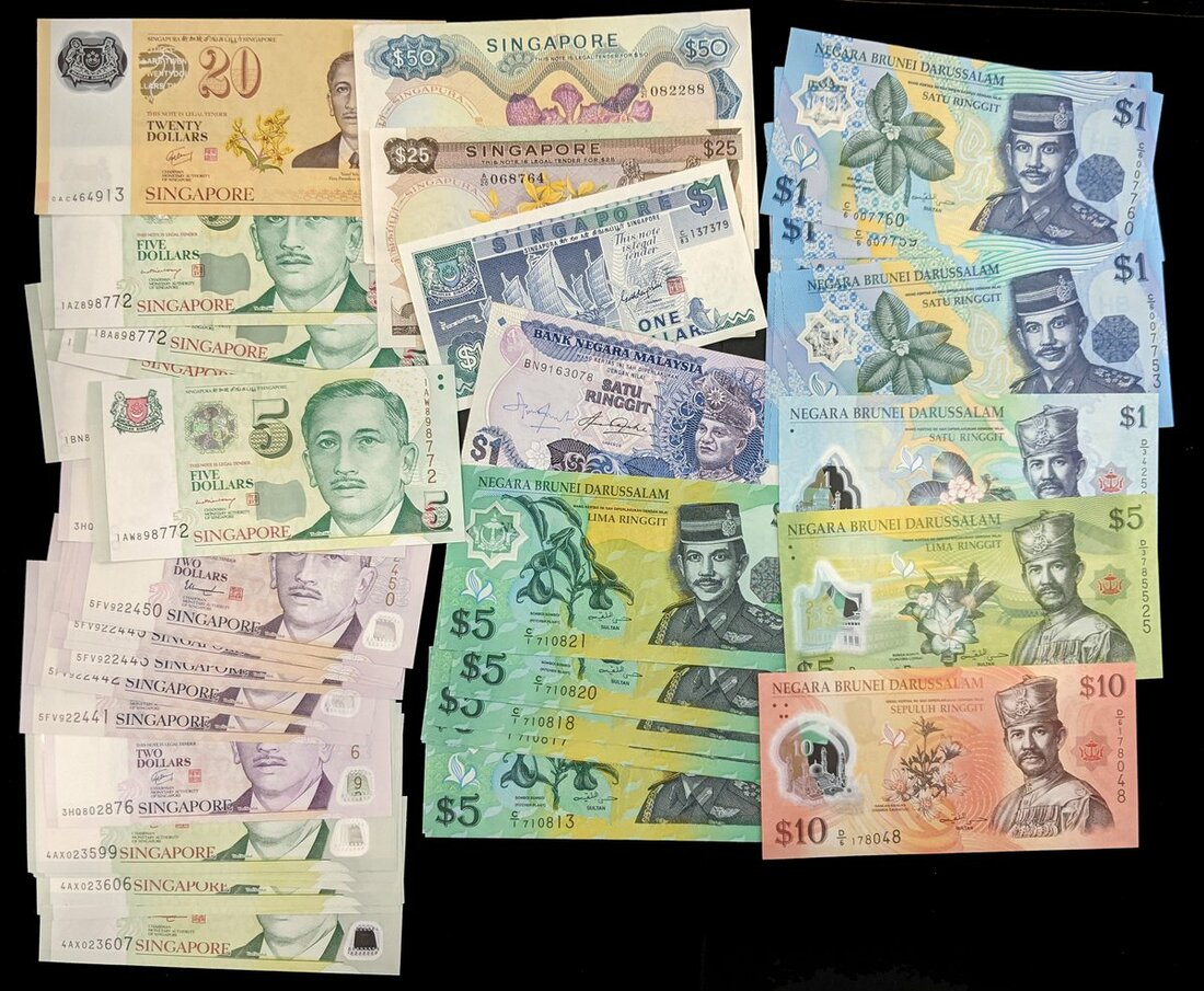 (x) A group of South East Asia notes, including Brunei 1 ringgit (10), 5 ringgit (10) 1996, 1, 5 and 10 ringgit 2011, Malaysia 1 ringgit 1982, Singapore $25 and $50 1970-71, $1 1987, $5 (5) 2004 with matching serial numbers, $2 (12), $5 2010-15, $20 2007,