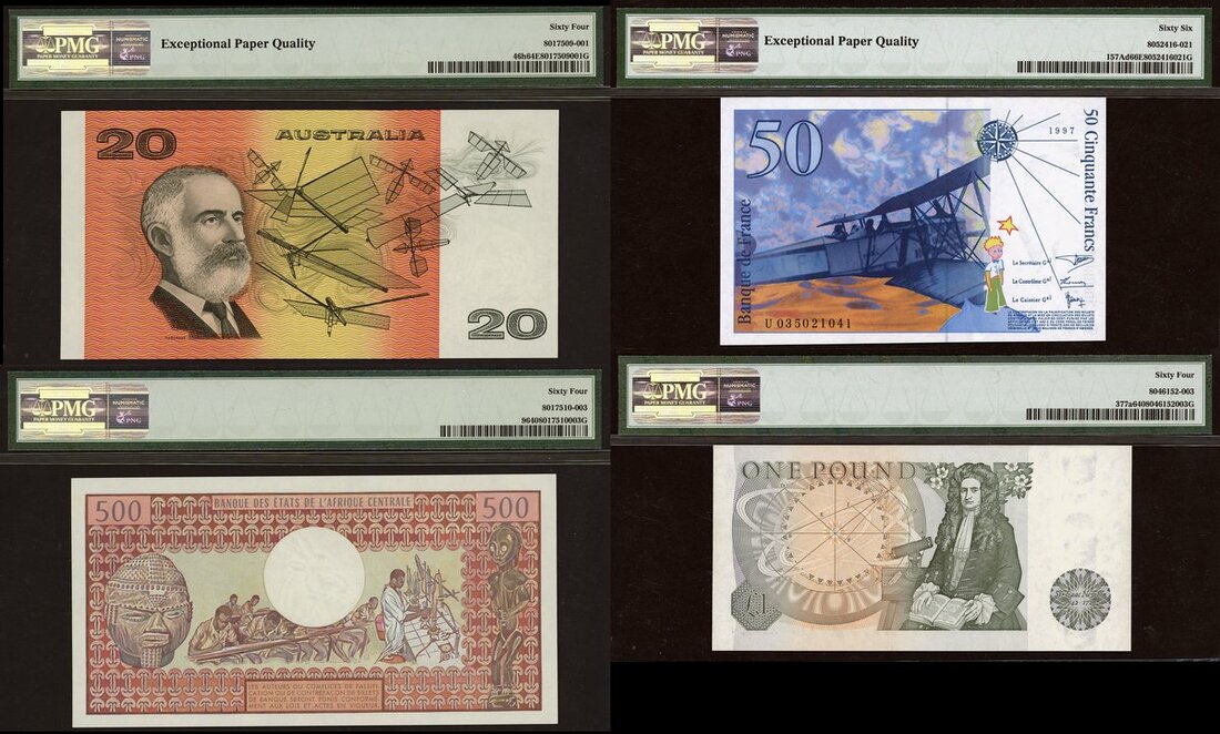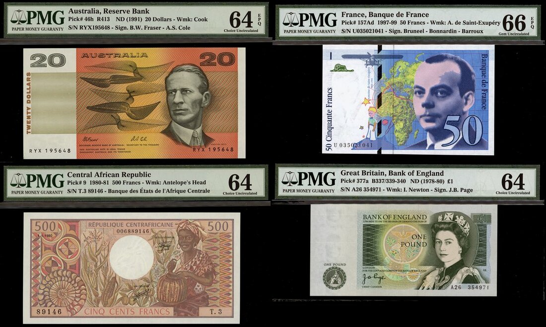 (Pick 46h, 9, 157Ad, 377a), in PMG holders 64EPQ, 64, 66EPQ, 64 (4 notes)