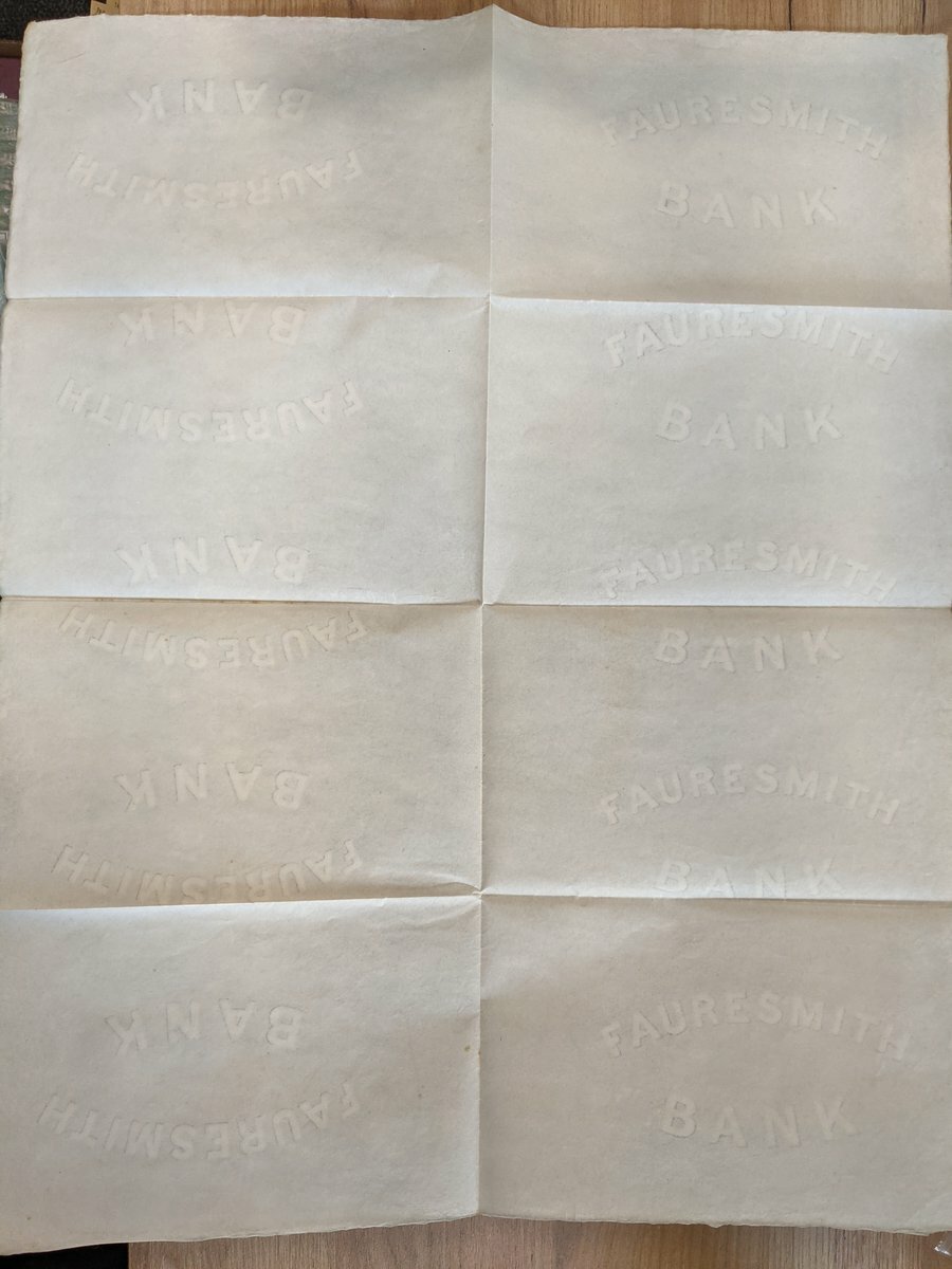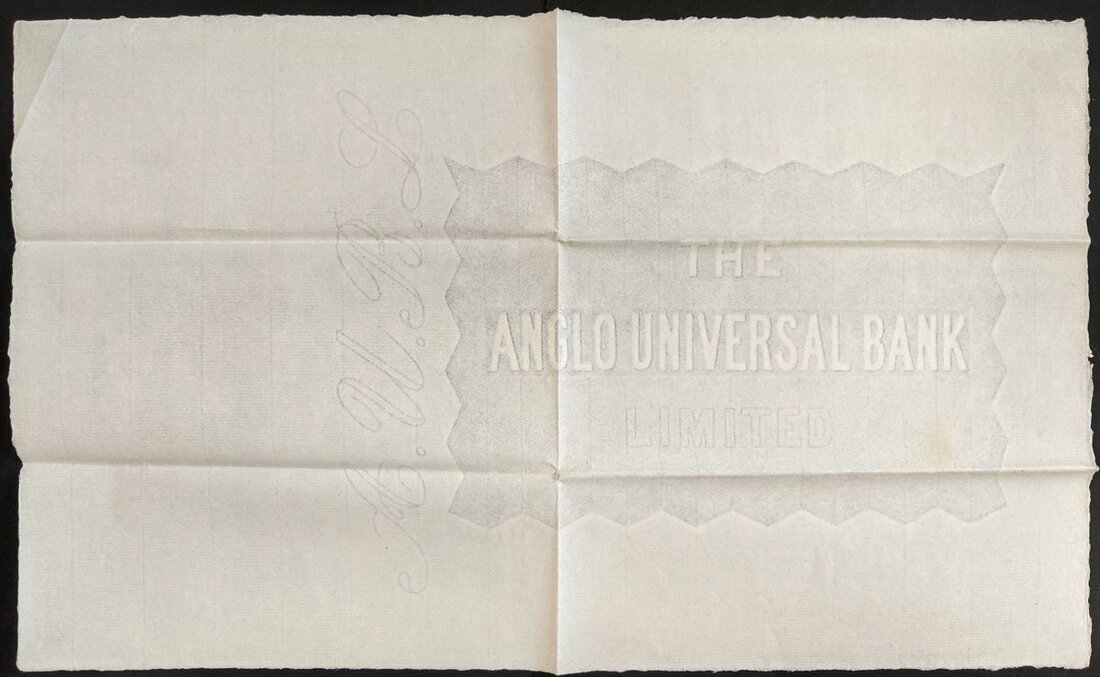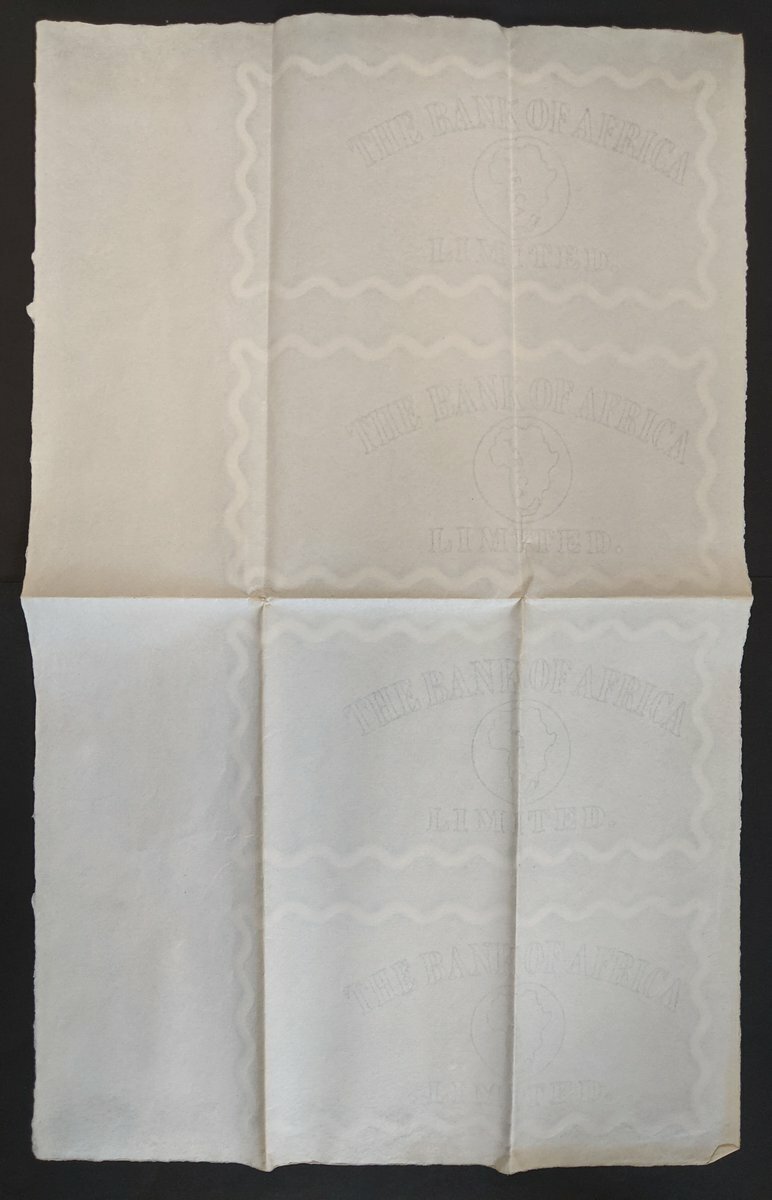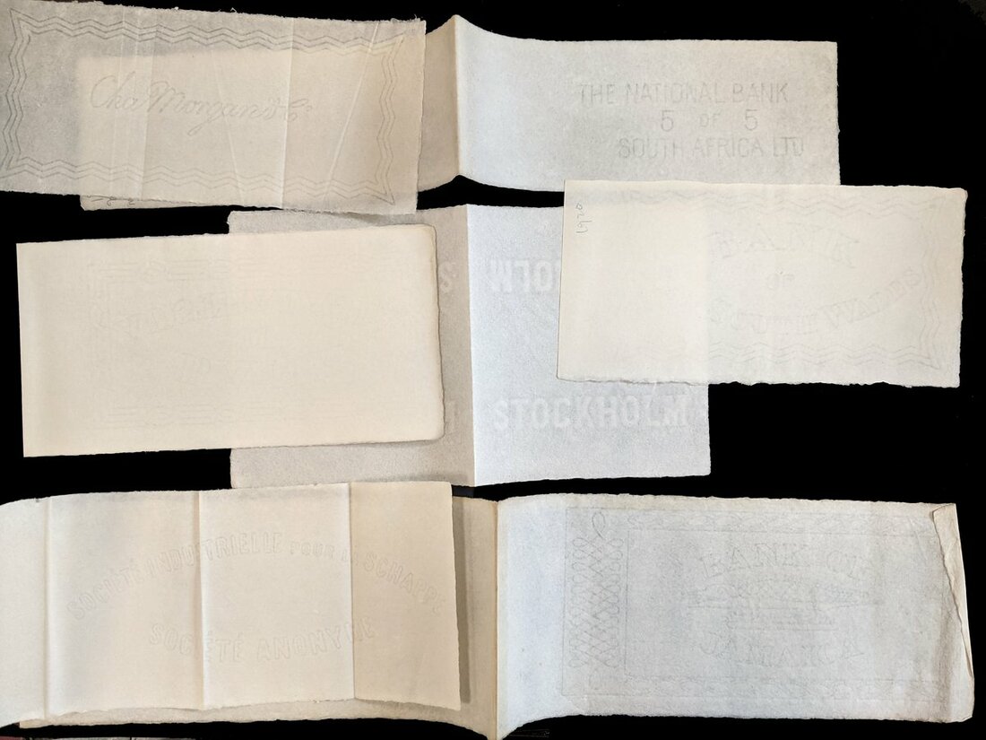 A group of watermark paper, ND, including The Bank of Africa, Bank of Jamaica, The Bank of British Colombia, Fauresmith Bank, Societe Induistrielle pour la Schappe, The National Bank of South Africa, The Anglo Universal Bank, also some with ornate shapes and patterns only,
